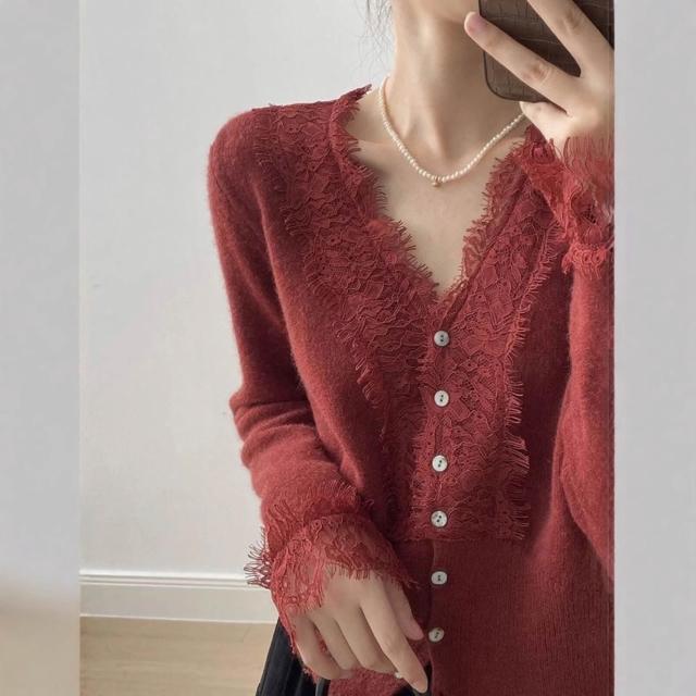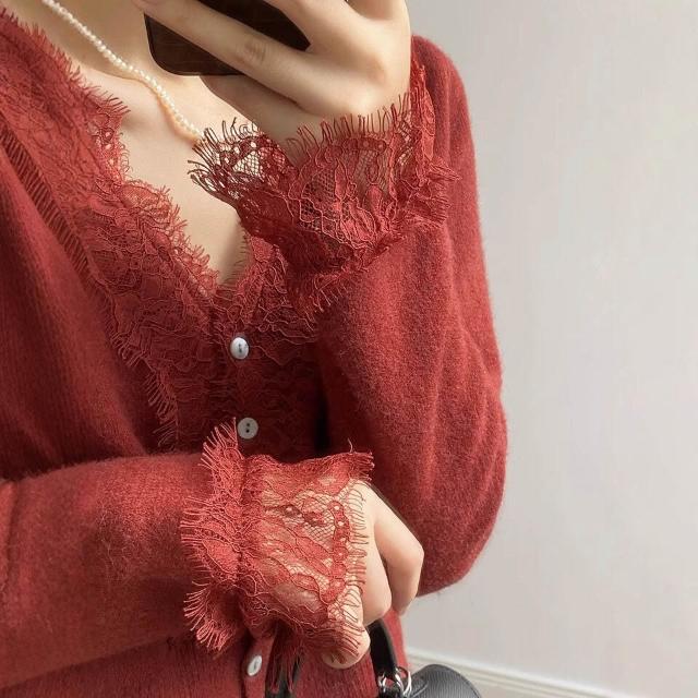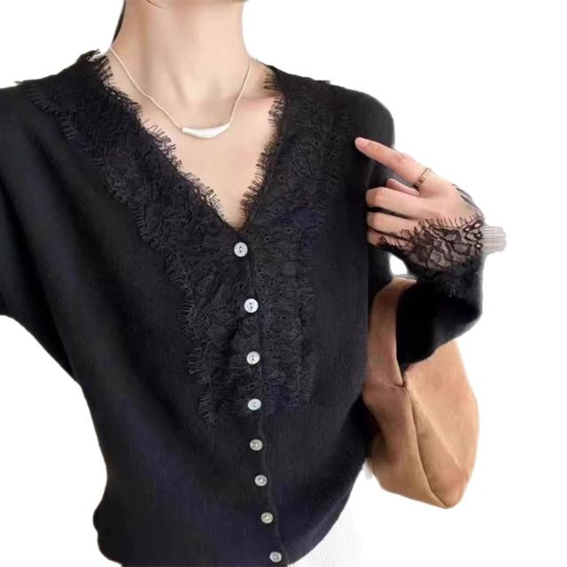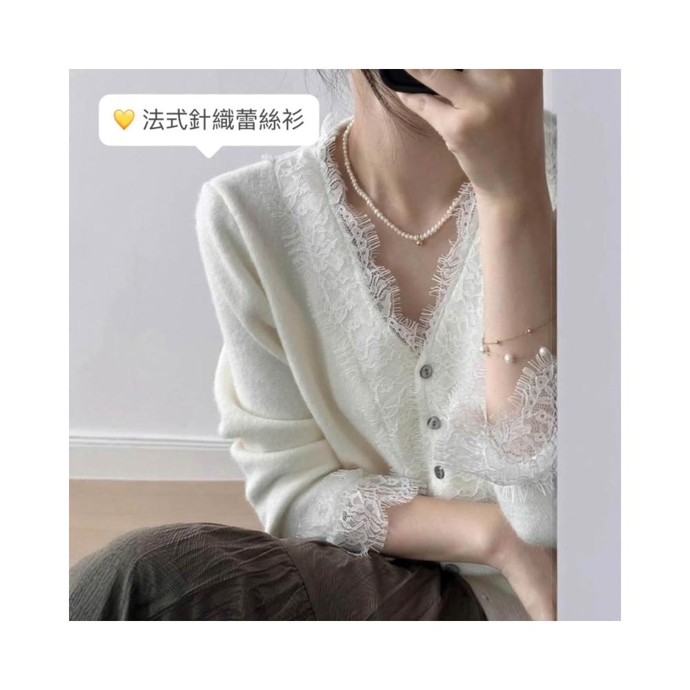 熱銷上衣免運 法式 針織衫 女毛衣V領 洋氣收腰 蕾絲開衫 內搭薄款上衣