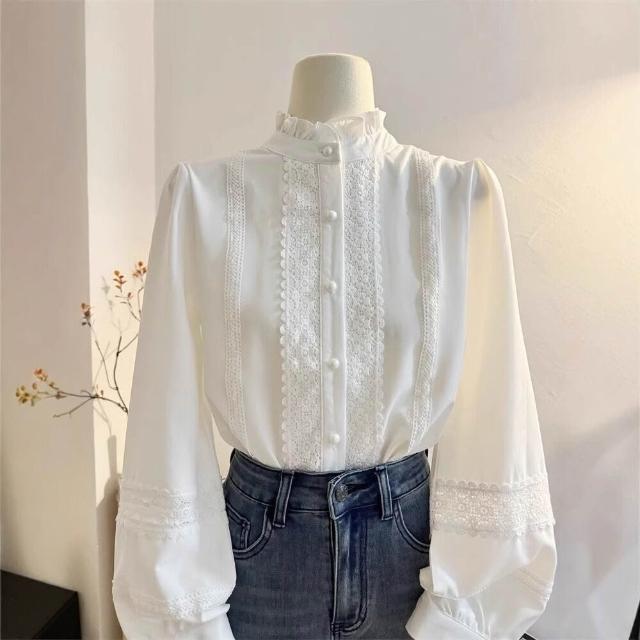 熱銷上衣免運 蕾絲花邊拼接白色木耳立領襯衫女2025秋洋氣內搭燈籠長袖小衫上衣