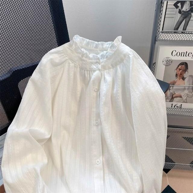 熱銷上衣免運 法式木耳荷葉邊立領襯衫女春秋季設計感小眾白色內搭打底長袖上衣