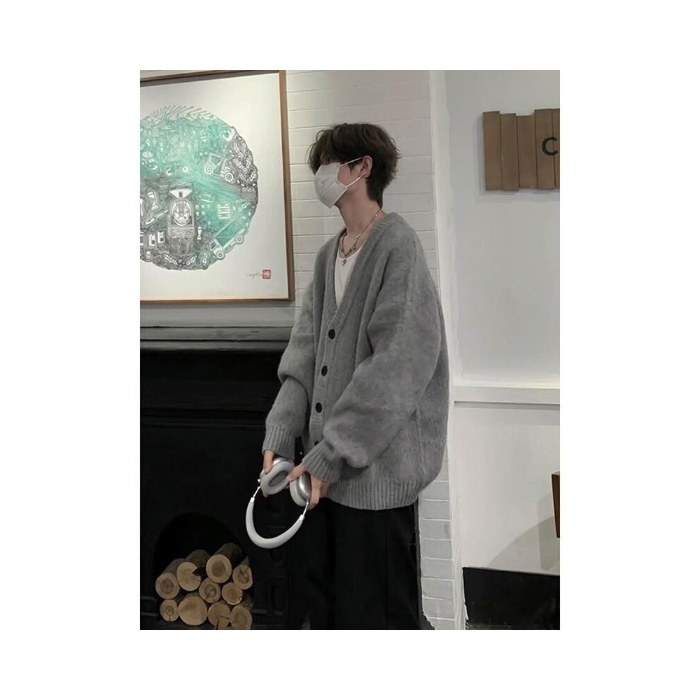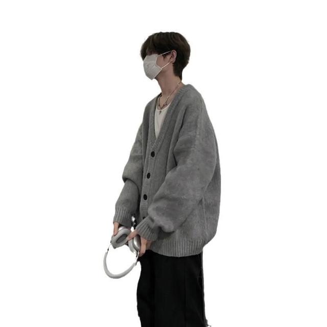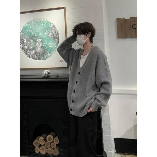 針織衫 高級感V領毛衣男款開衫青果領針織衫oversize慵懶風寬松線衣外套