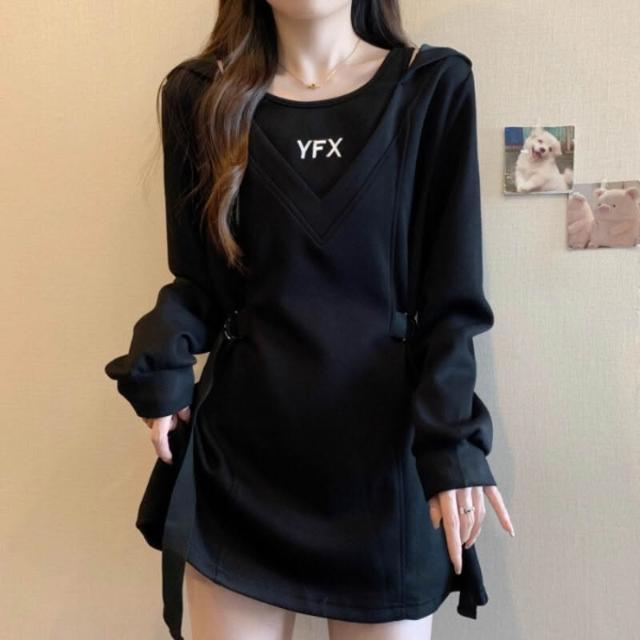 超好看 胖mm小眾收腰連帽正肩衛衣女顯瘦遮肚假兩件時尚長袖上衣