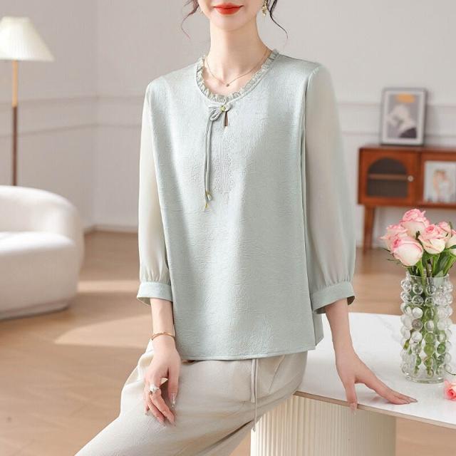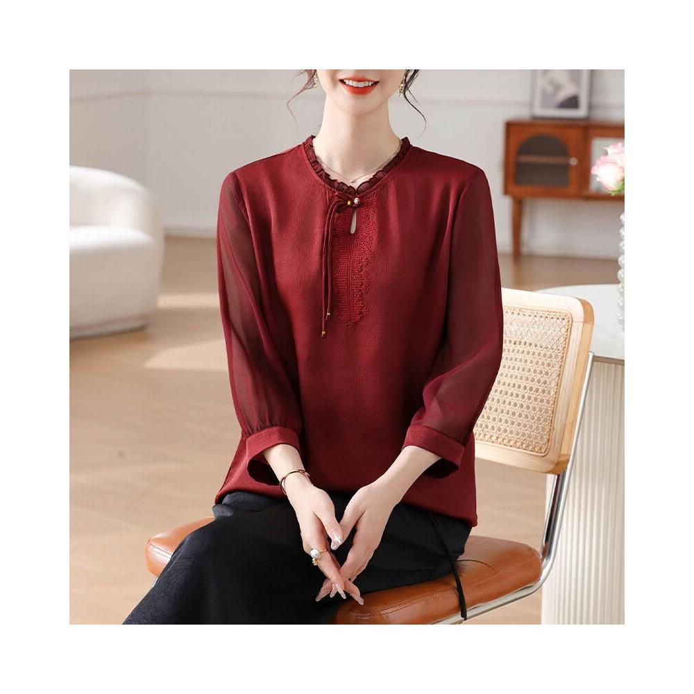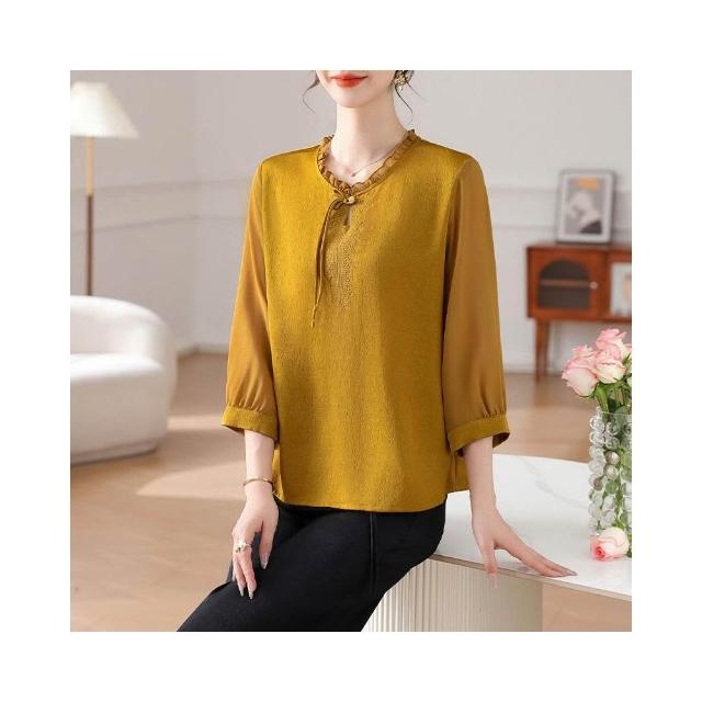 新中式母親節媽媽夏裝上衣 禮服紅色七分袖小衫 喜婆婆婚宴裝 盤扣木耳邊上衣
