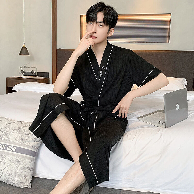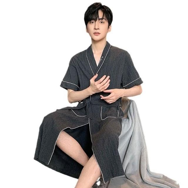 短袖睡袍男士春秋季薄款棉質休閑寬松酒店浴袍青年家居服大碼男袍