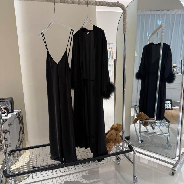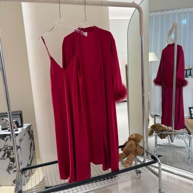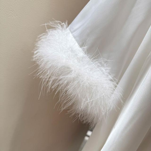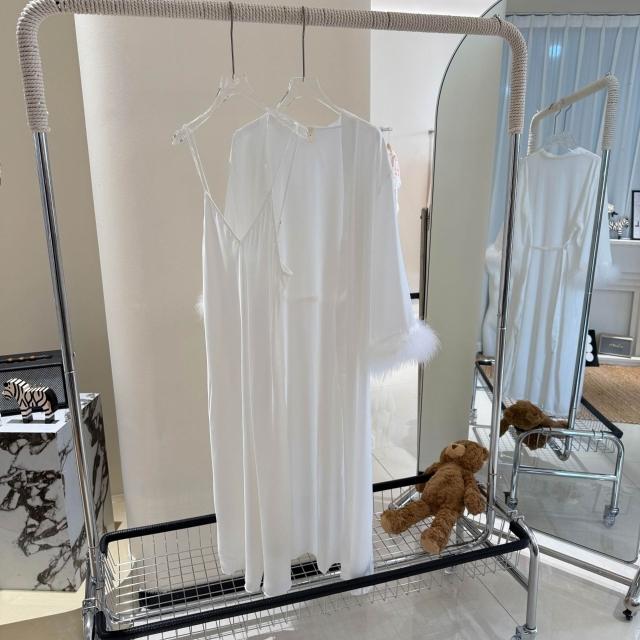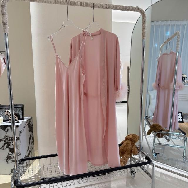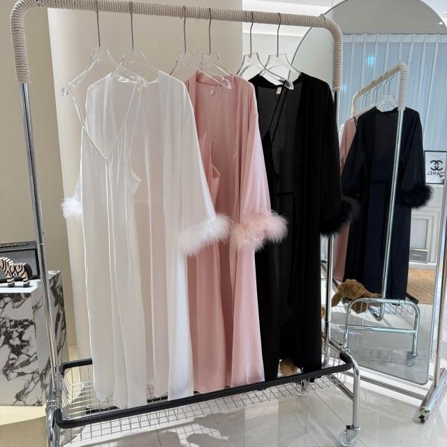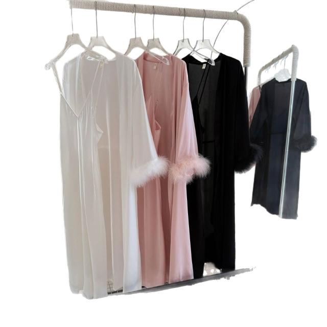 法式性感睡衣女加長款冰絲V領吊帶睡裙睡袍兩件套鴕鳥羽毛家居服