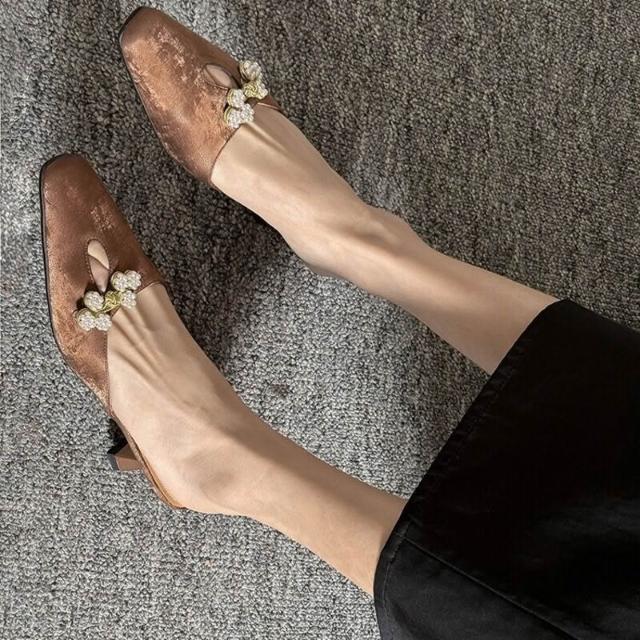 沐歆 法式輕奢真皮包頭半拖鞋女2024夏新款方頭國風涼拖細跟高跟穆勒鞋