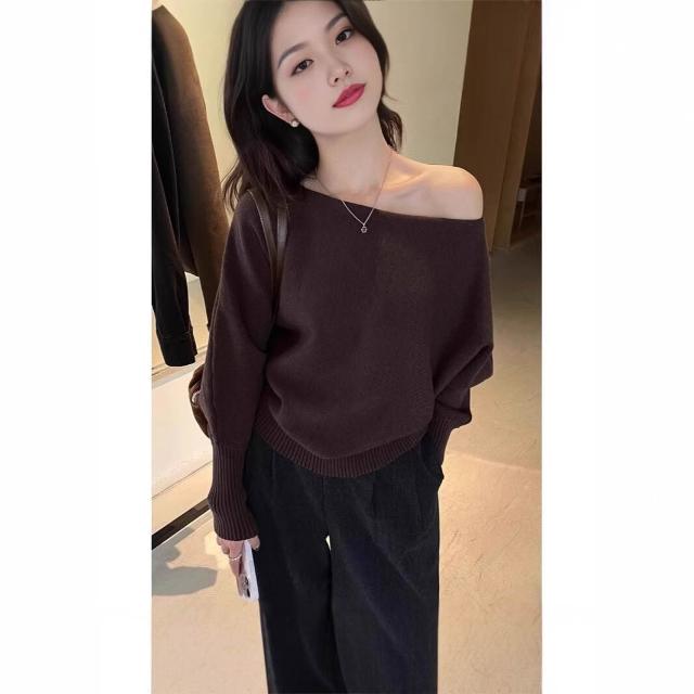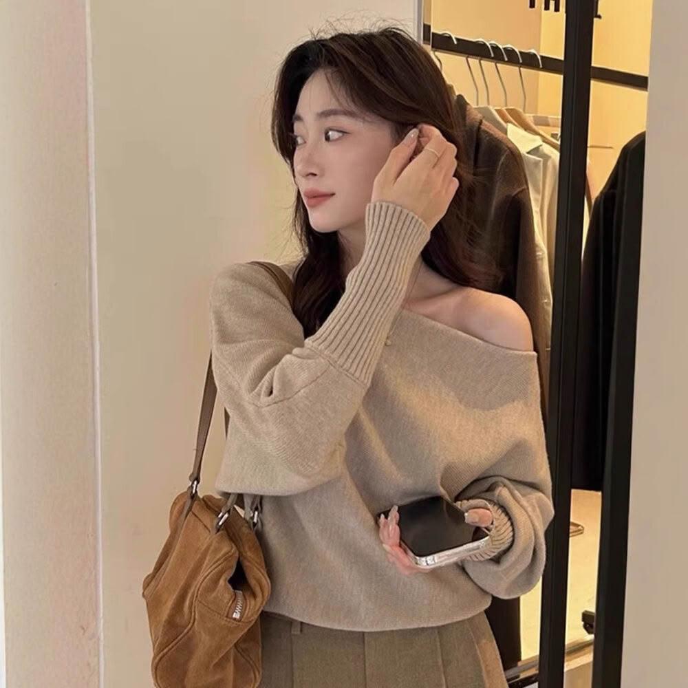 卡其色心機純欲風一字肩露肩針織衫女秋季高級感慵懶毛衣內搭上衣