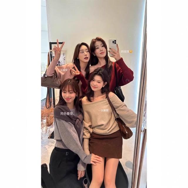 卡其色心機純欲風一字肩露肩針織衫女秋季高級感慵懶毛衣內搭上衣