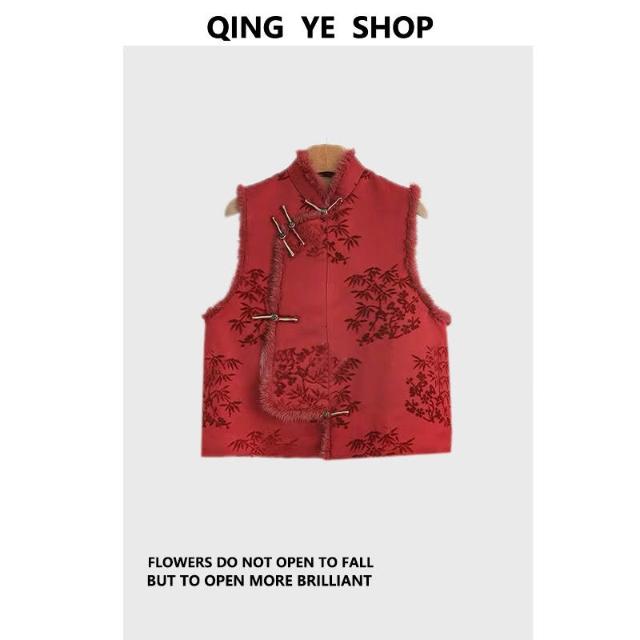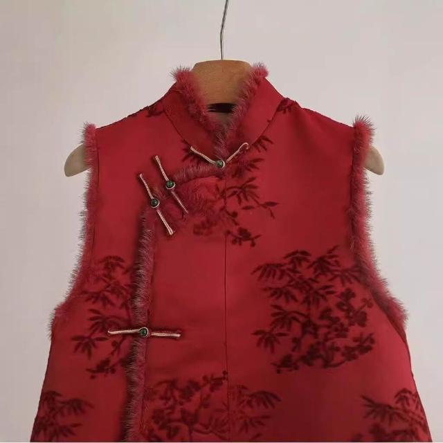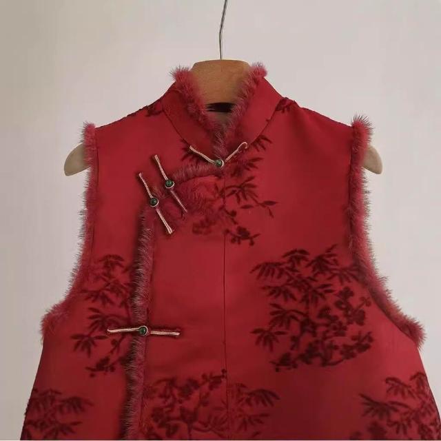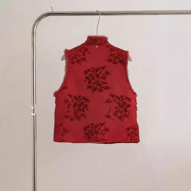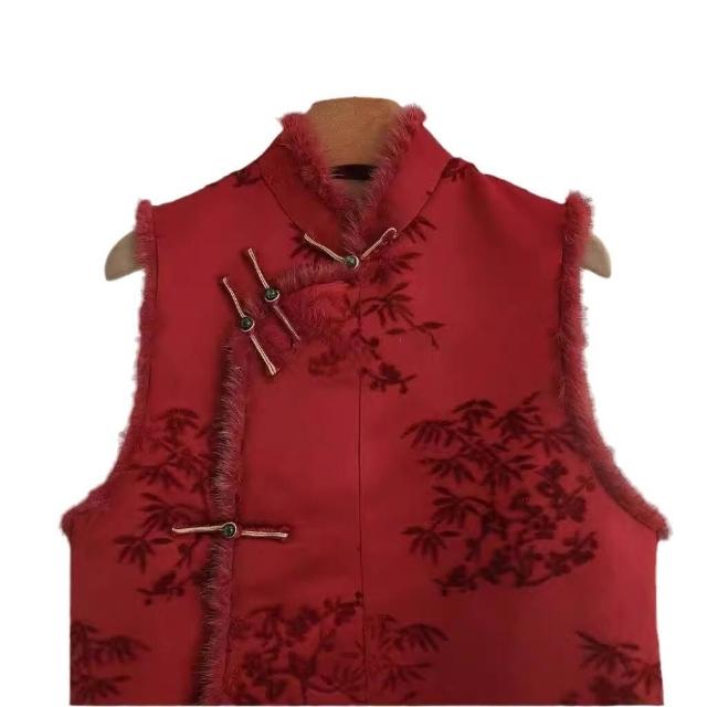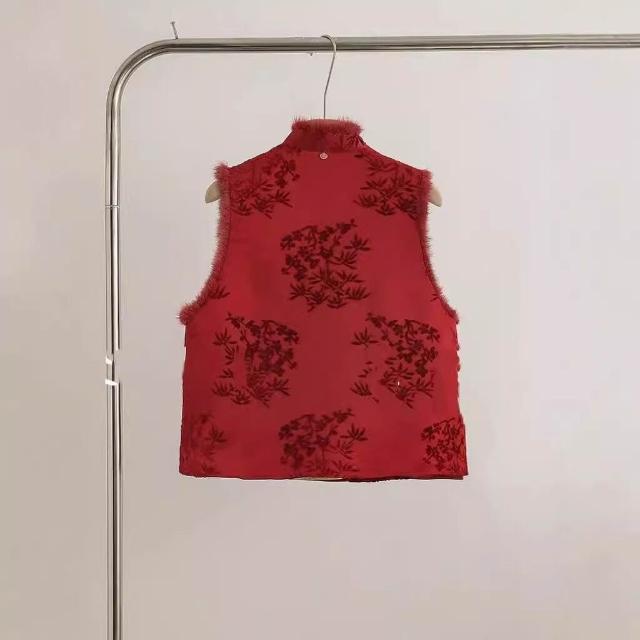 秋冬季新款新中式女裝中國風紅色毛領馬甲背心獨特別致盤扣上衣女
