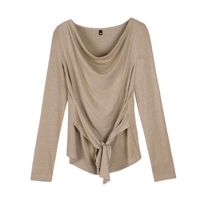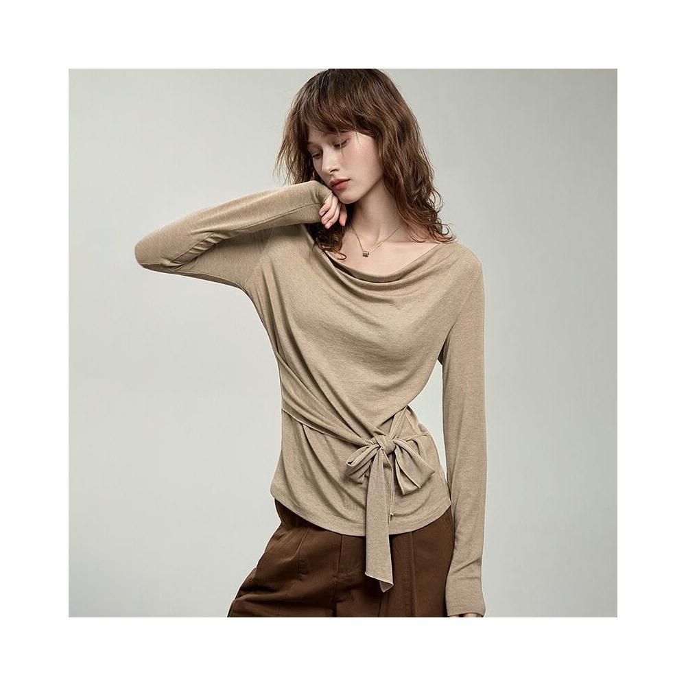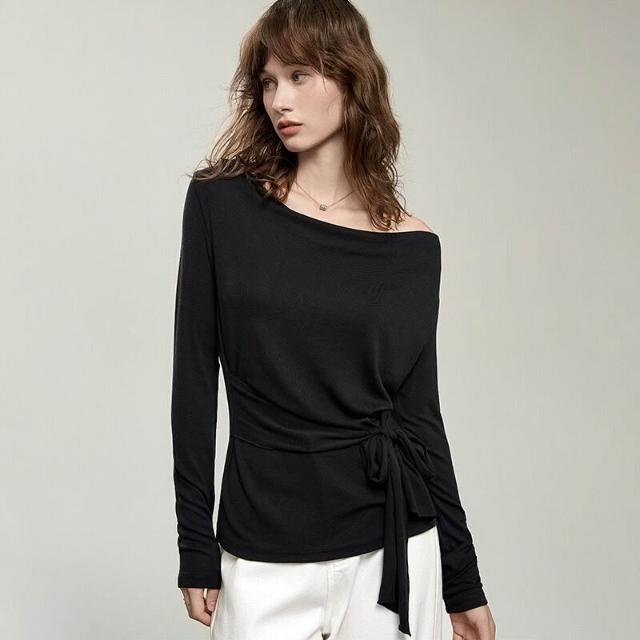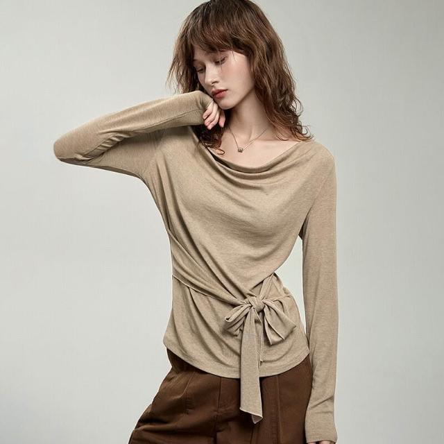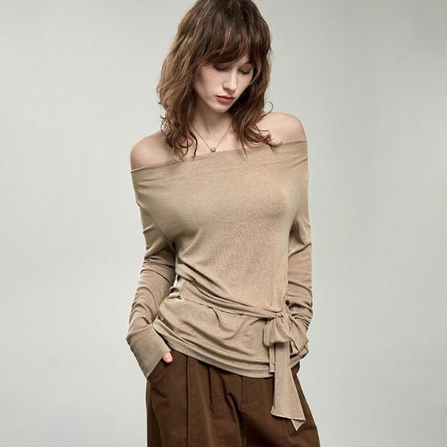 氣質設計感萊賽爾羊毛蕩領t恤女2026春季新款一字領收腰綁帶上衣