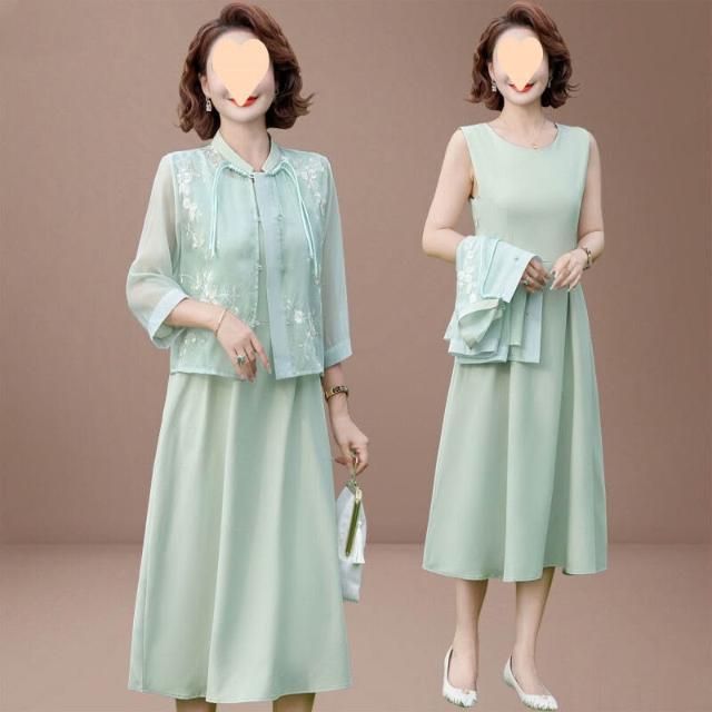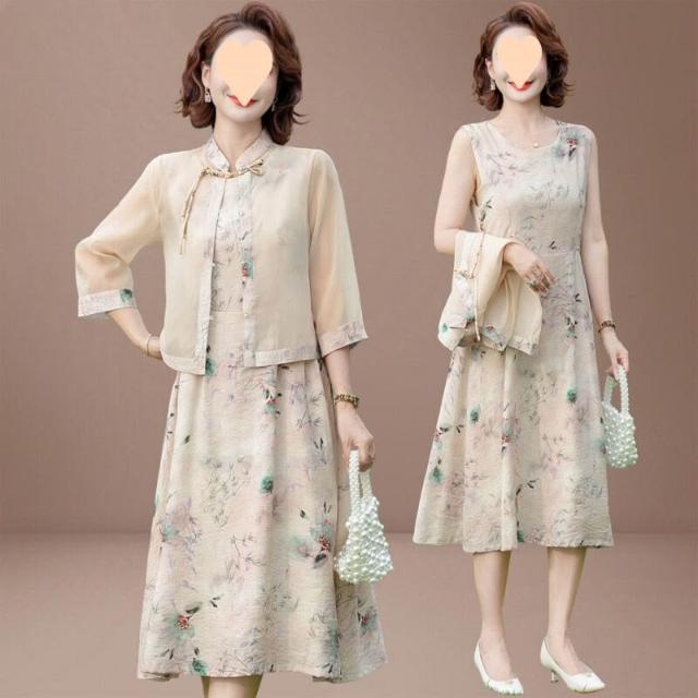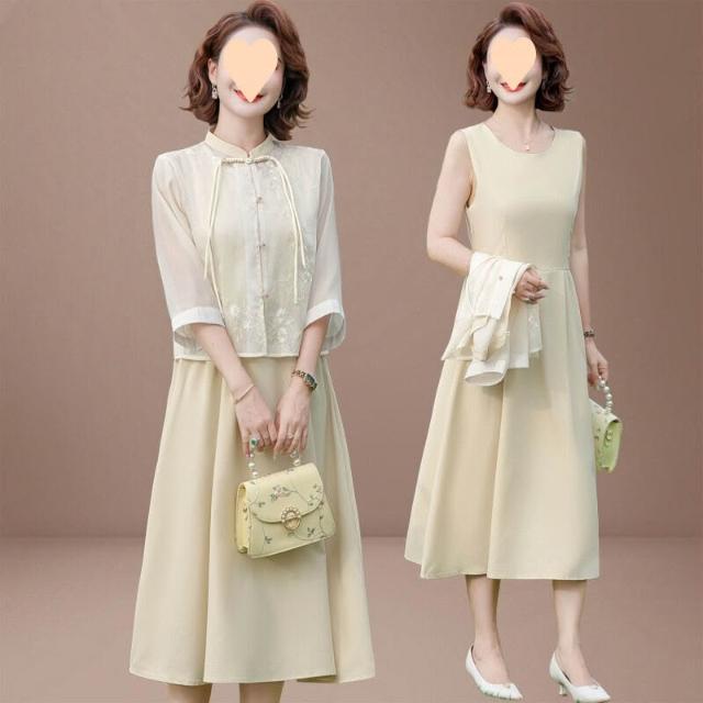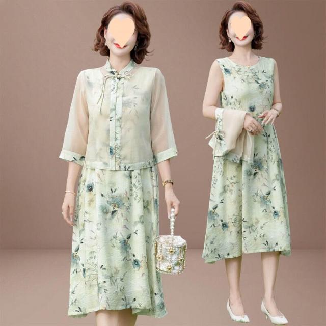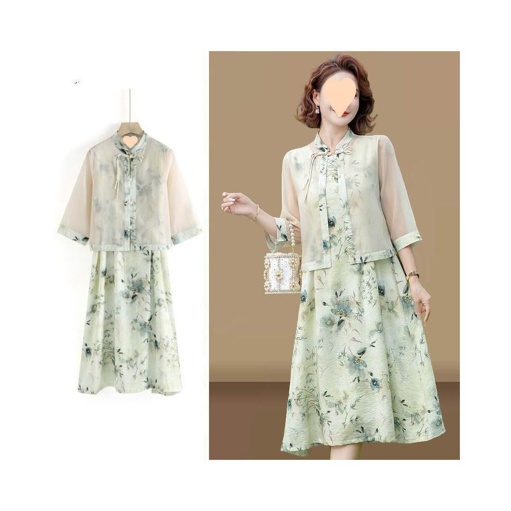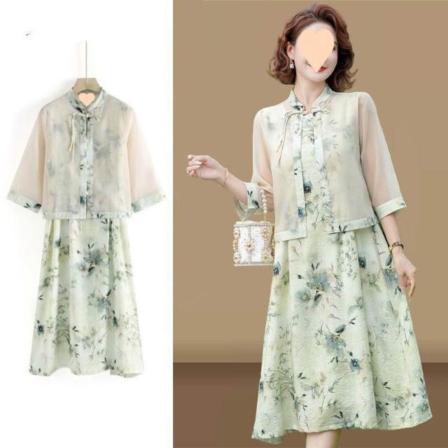 新中式媽媽夏裝連衣裙套裝國風外套中老年女雪紡小衫兩件套