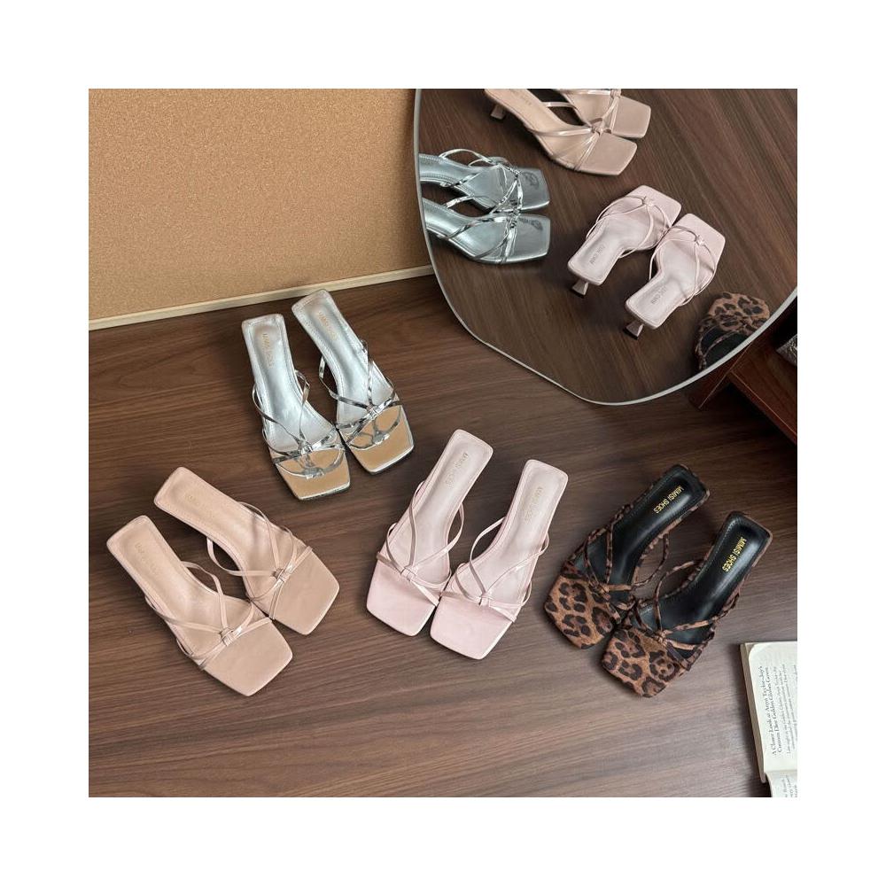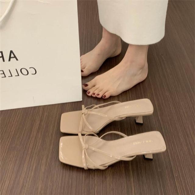 方頭中跟涼拖鞋女鞋外穿2025夏季法式一字拖裸色高跟鞋露趾拖鞋女