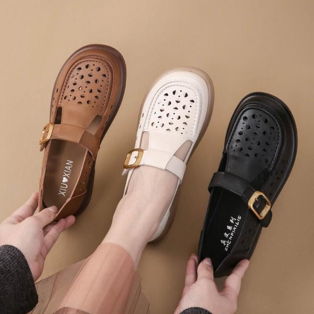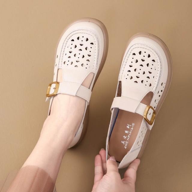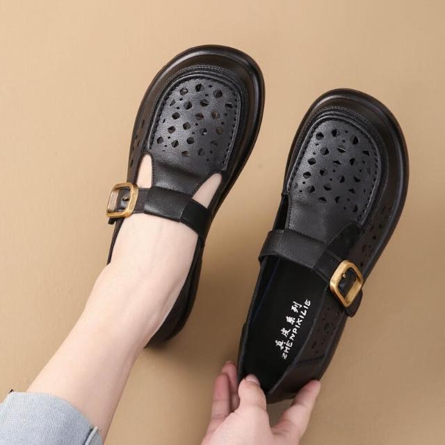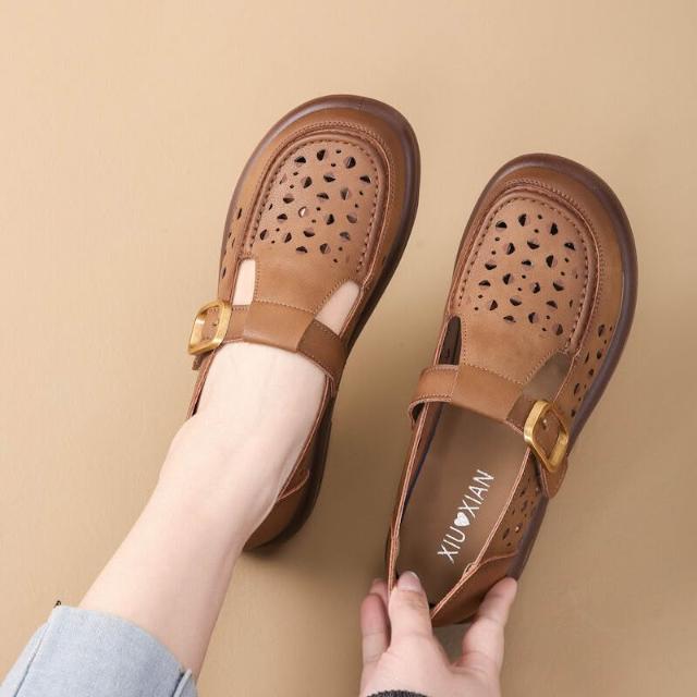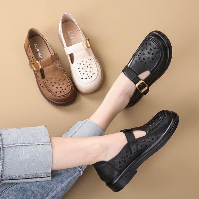 沐歆 夏季軟底媽媽鞋 镂空透氣舒適平底鞋 二層牛皮中年女士中老年洞洞涼鞋