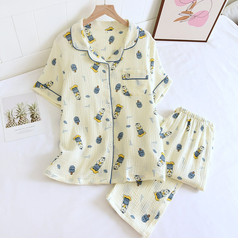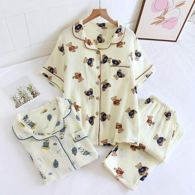 绉紗翻領開衫短袖長褲睡衣套裝春夏秋薄棉質水洗雙層绉布女家居服