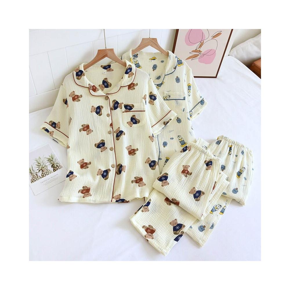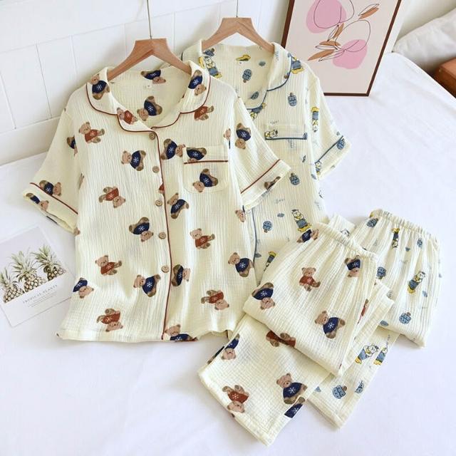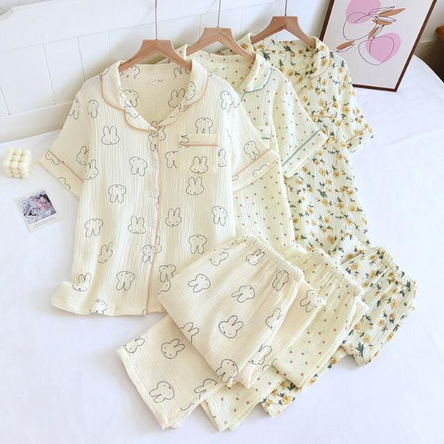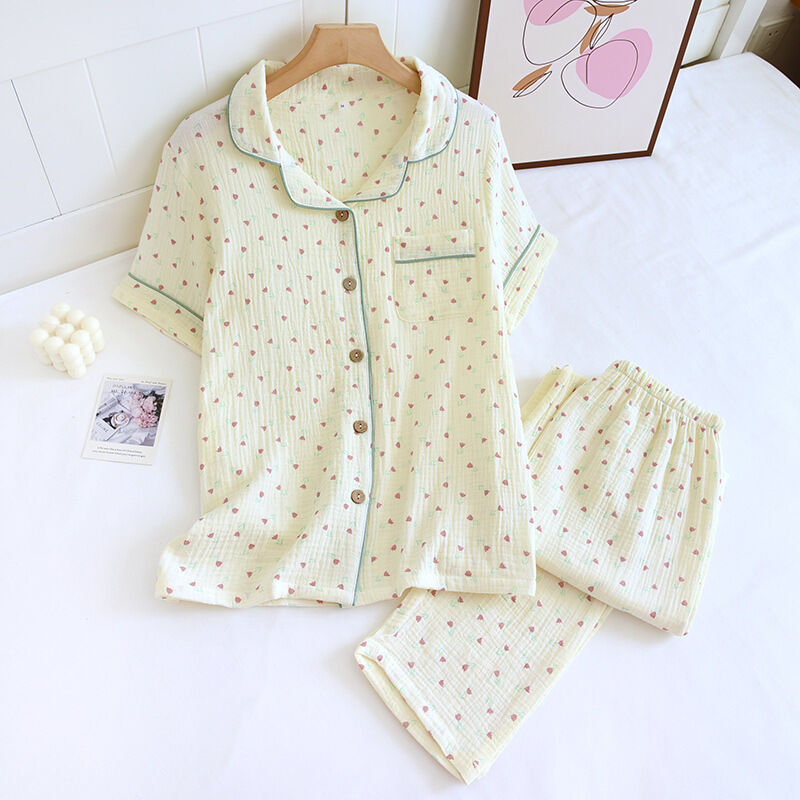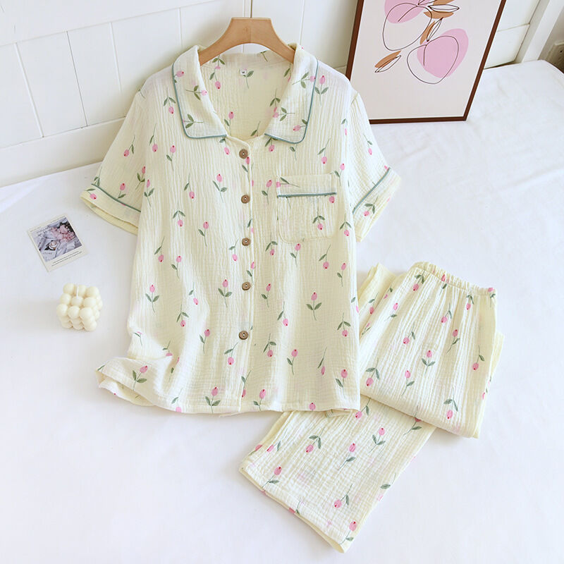 绉紗翻領開衫短袖長褲睡衣套裝春夏秋薄棉質水洗雙層绉布女家居服