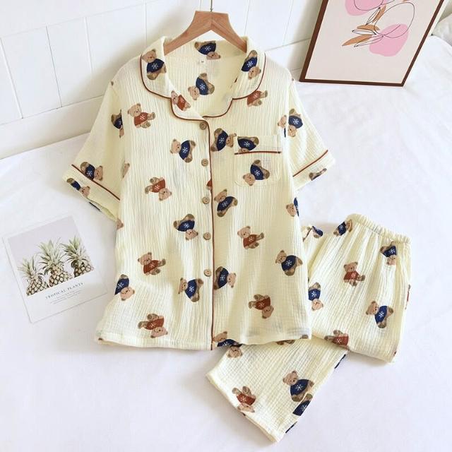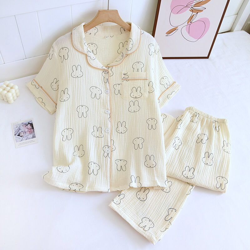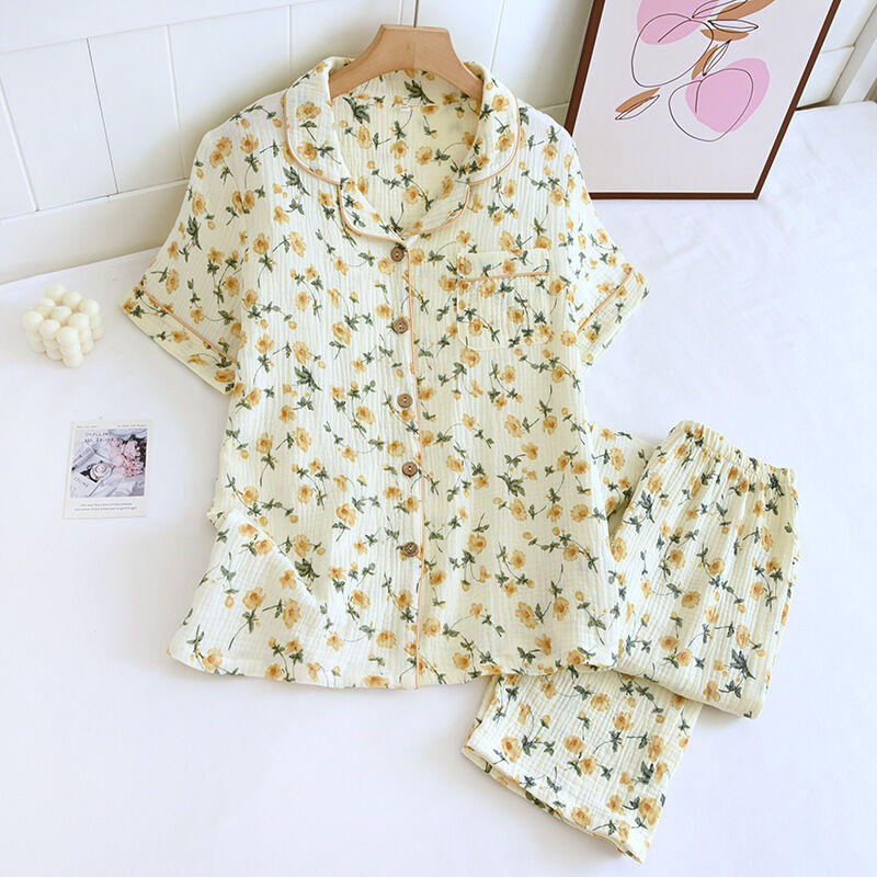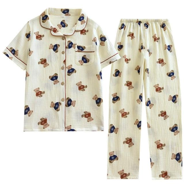绉紗翻領開衫短袖長褲睡衣套裝春夏秋薄棉質水洗雙層绉布女家居服