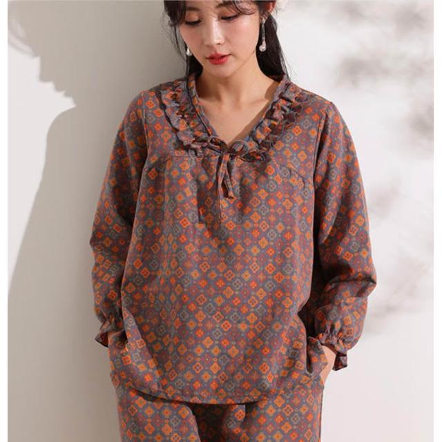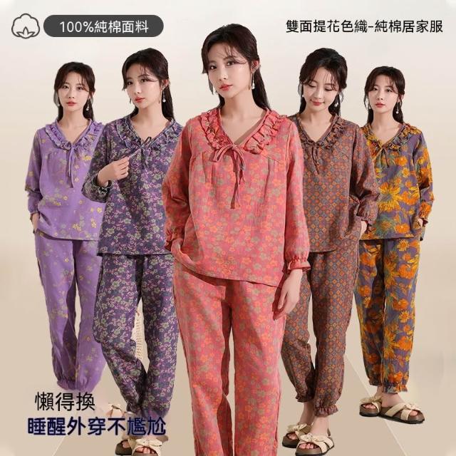 沐歆 復古新中式國風春夏薄款純棉睡衣女 色織提花雙層紗布收口睡衣 長袖長褲可外穿家居服