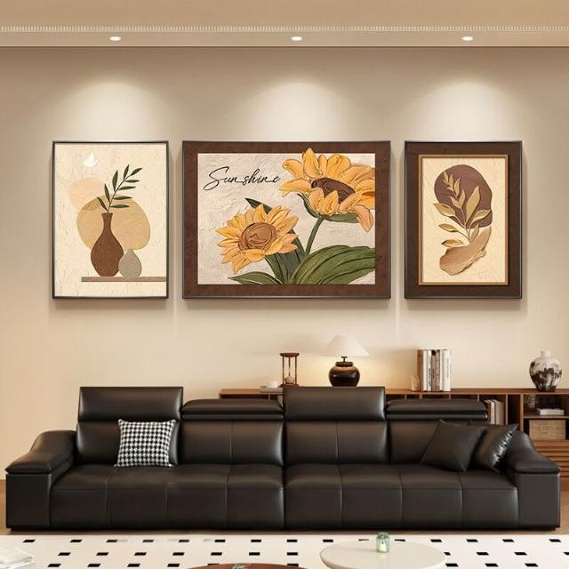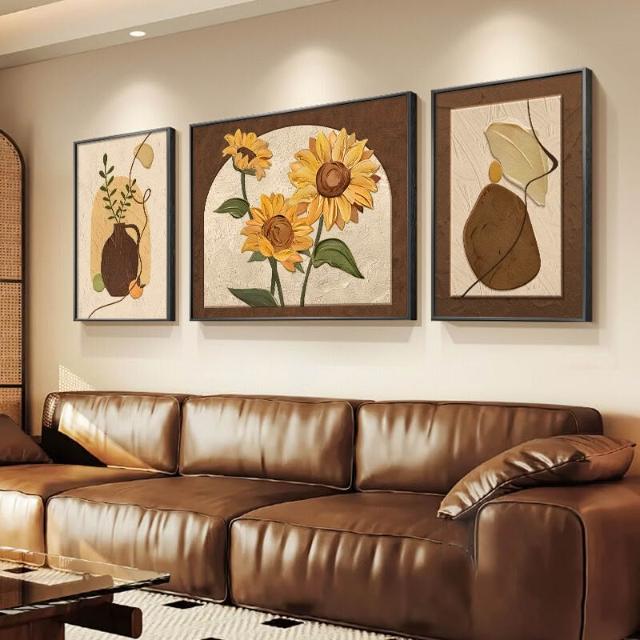 法式客廳裝飾畫現代簡約沙發背景墻掛畫中古向日葵高級感三聯壁畫