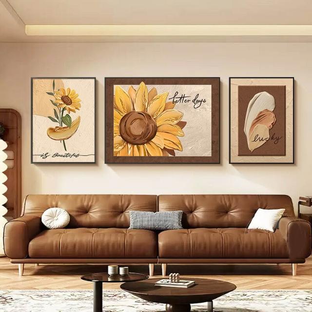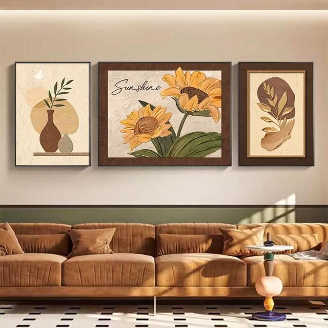法式客廳裝飾畫現代簡約沙發背景墻掛畫中古向日葵高級感三聯壁畫