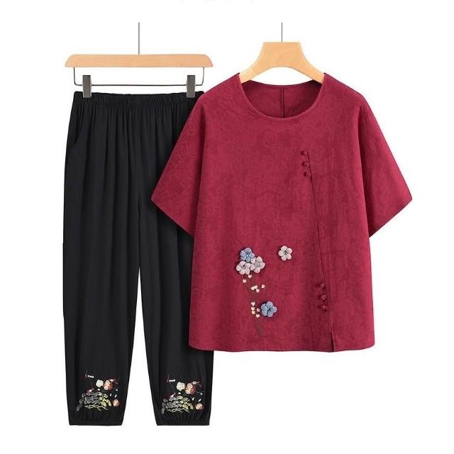 沐歆 母親節媽媽夏季棉麻套裝 中老年國風棉綢繡花上衣褲子兩件套 新中式短袖t恤梅花刺繡褲子