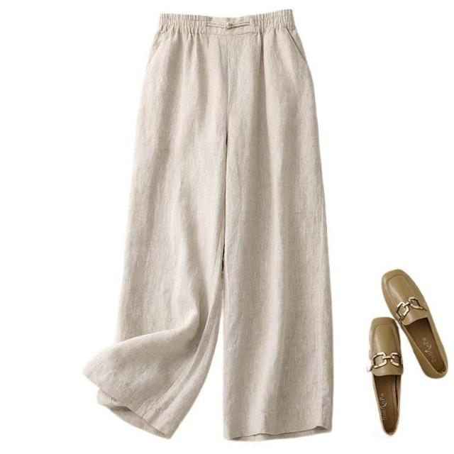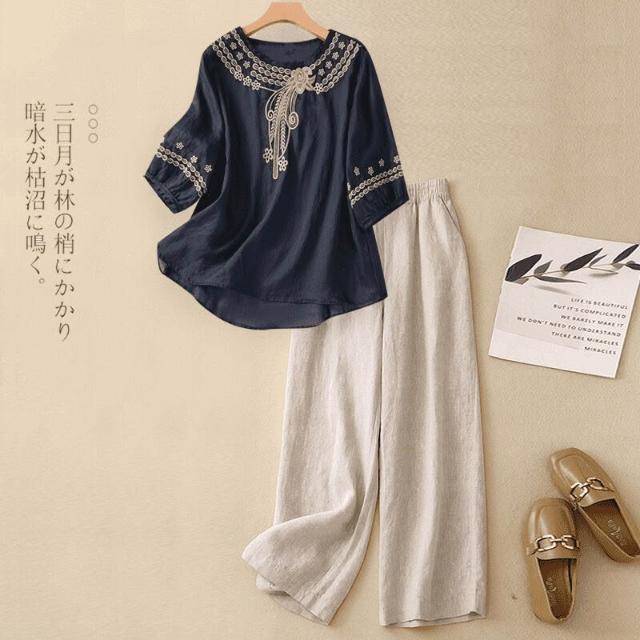 沐歆 媽媽夏裝棉麻套裝女 新款亞麻刺繡襯衫闊腿褲兩件套 中老年大碼夏季吸汗涼爽套裝