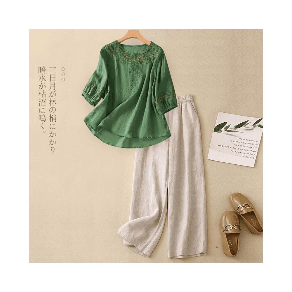 沐歆 媽媽夏裝棉麻套裝女 新款亞麻刺繡襯衫闊腿褲兩件套 中老年大碼夏季吸汗涼爽套裝