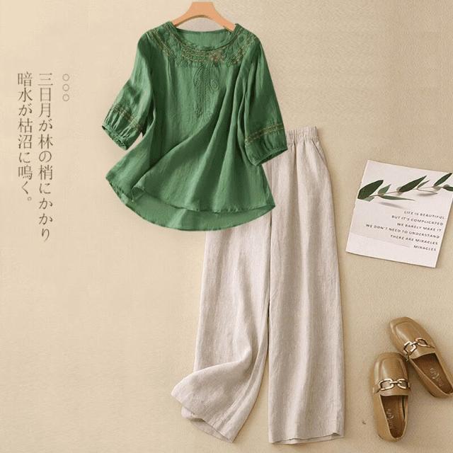 沐歆 媽媽夏裝棉麻套裝女 新款亞麻刺繡襯衫闊腿褲兩件套 中老年大碼夏季吸汗涼爽套裝