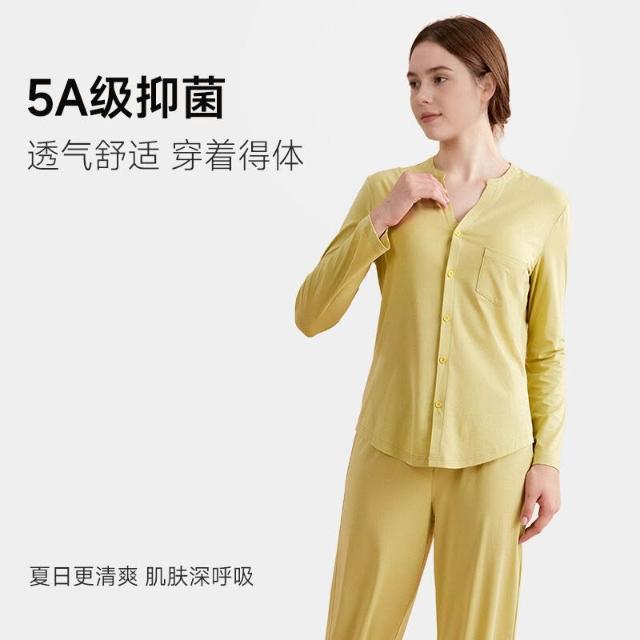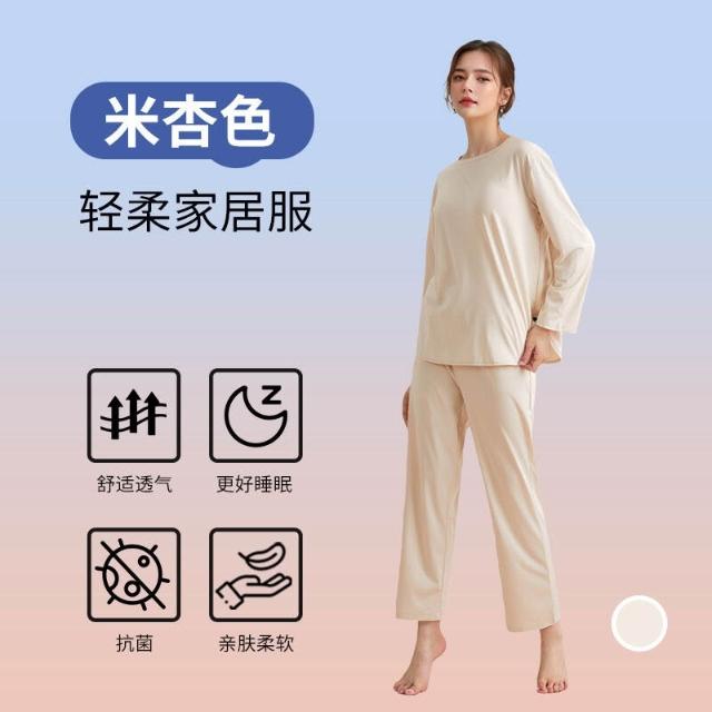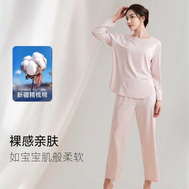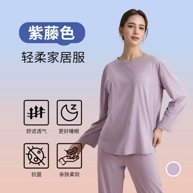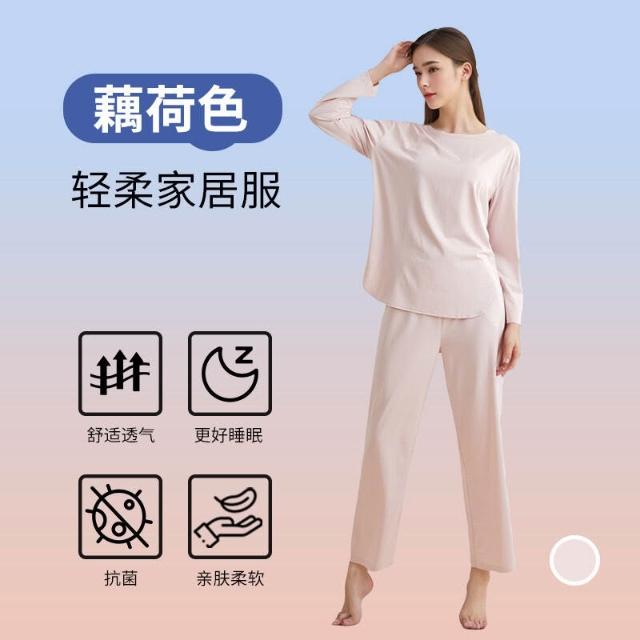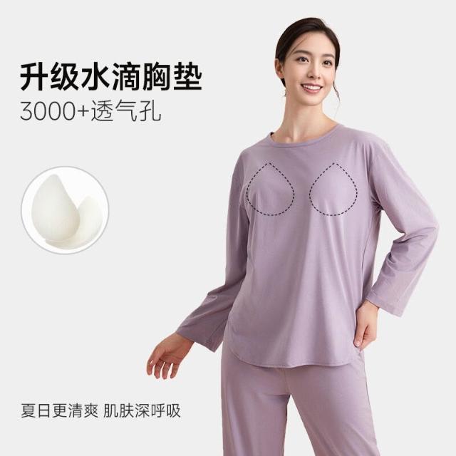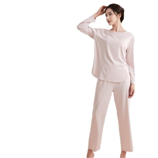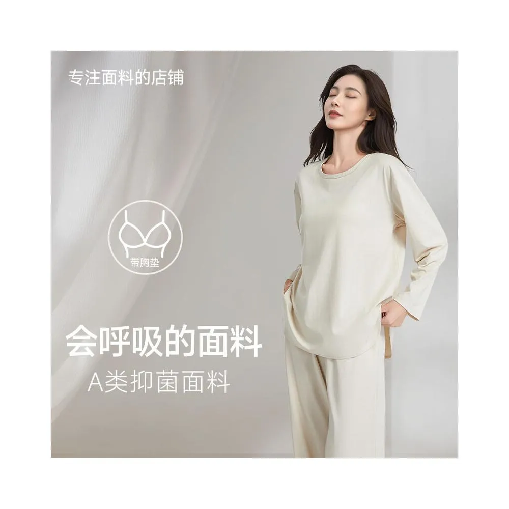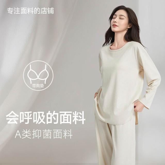 春秋帶胸墊圓領睡衣女家居服套裝秋衣秋褲外穿精梳棉萊賽爾面料