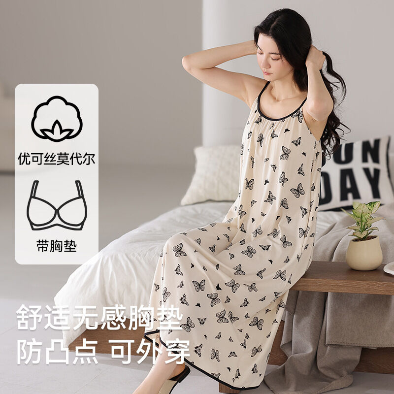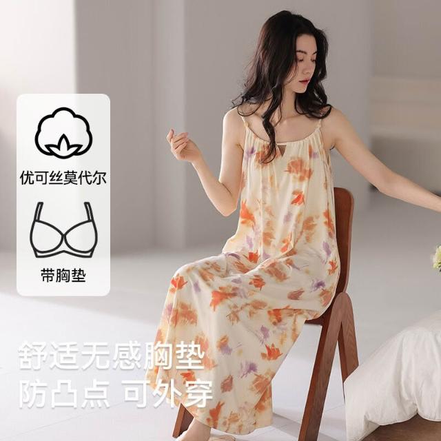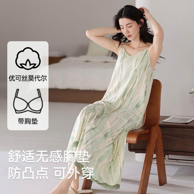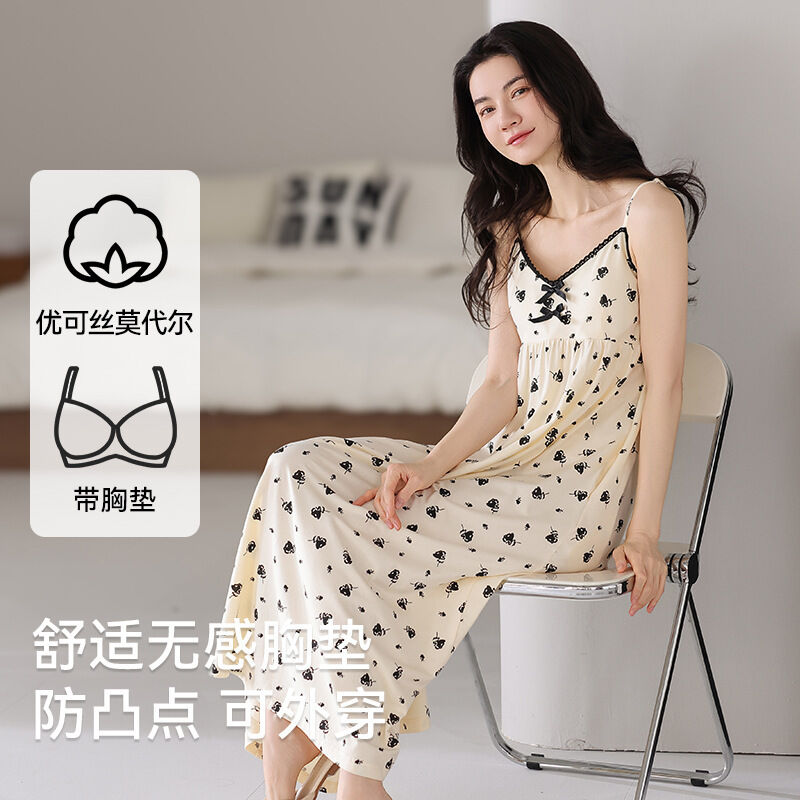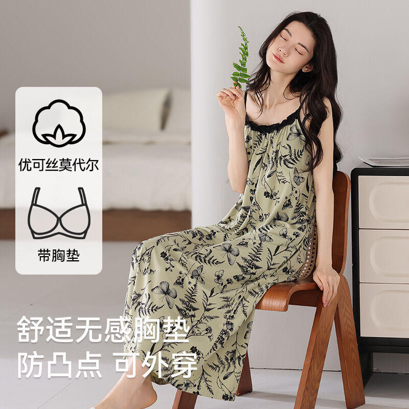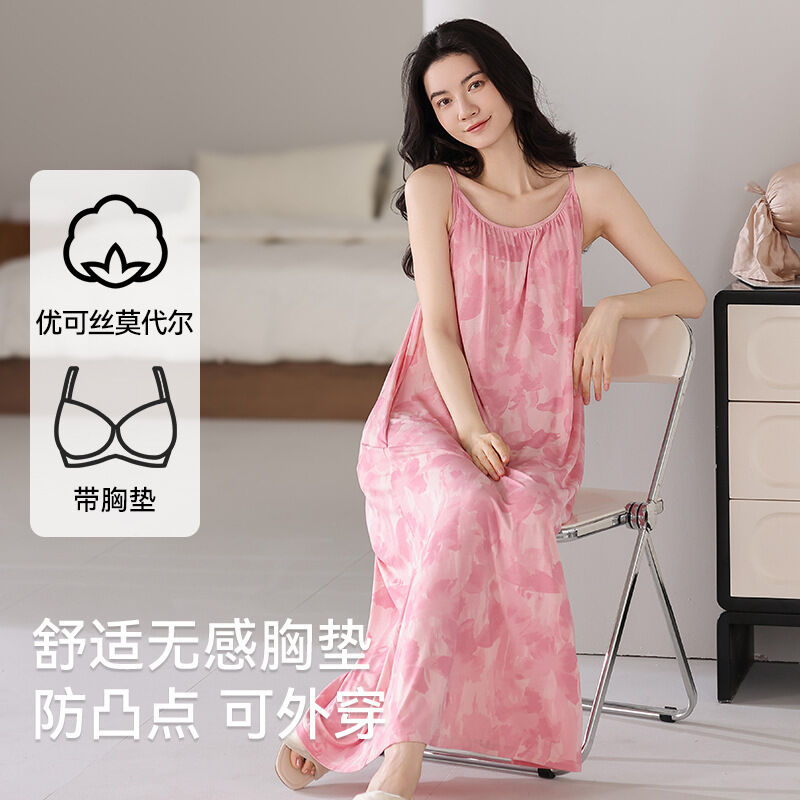 莫代爾睡裙女士夏季新款薄款吊帶棉綢睡衣帶胸墊連衣裙居家服夏款