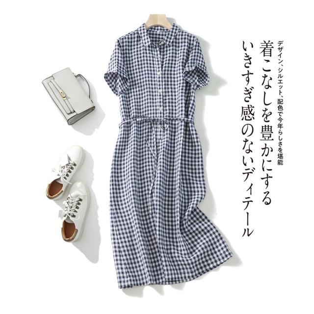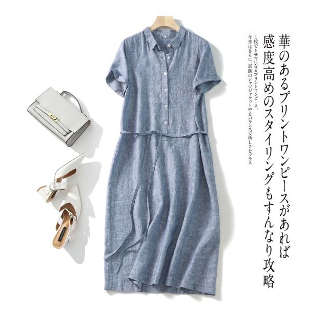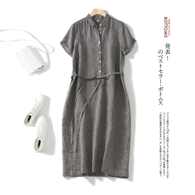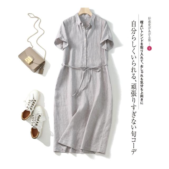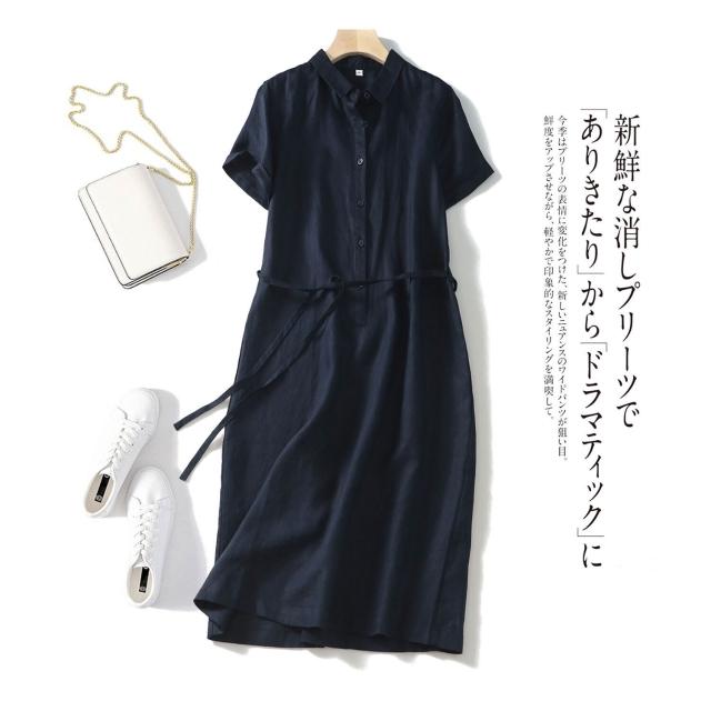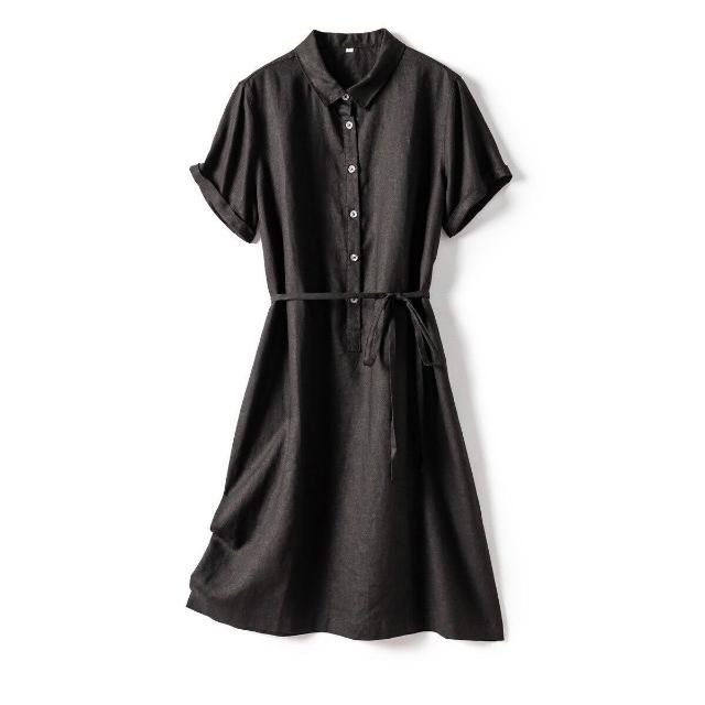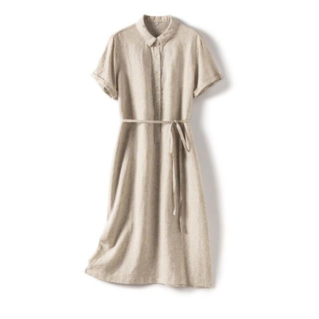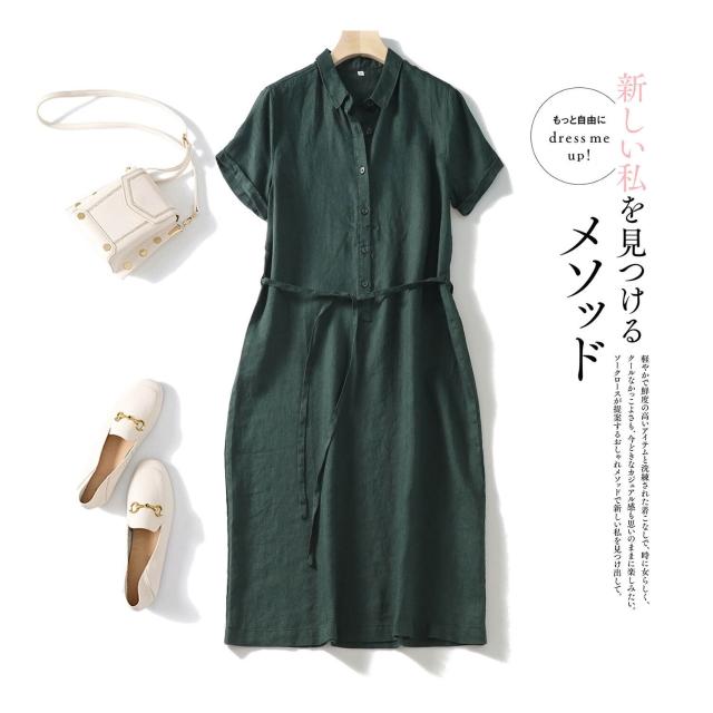 25年新貨篙階客供純亞麻日系腰帶POLO領短袖通勤簡約直筒連衣裙