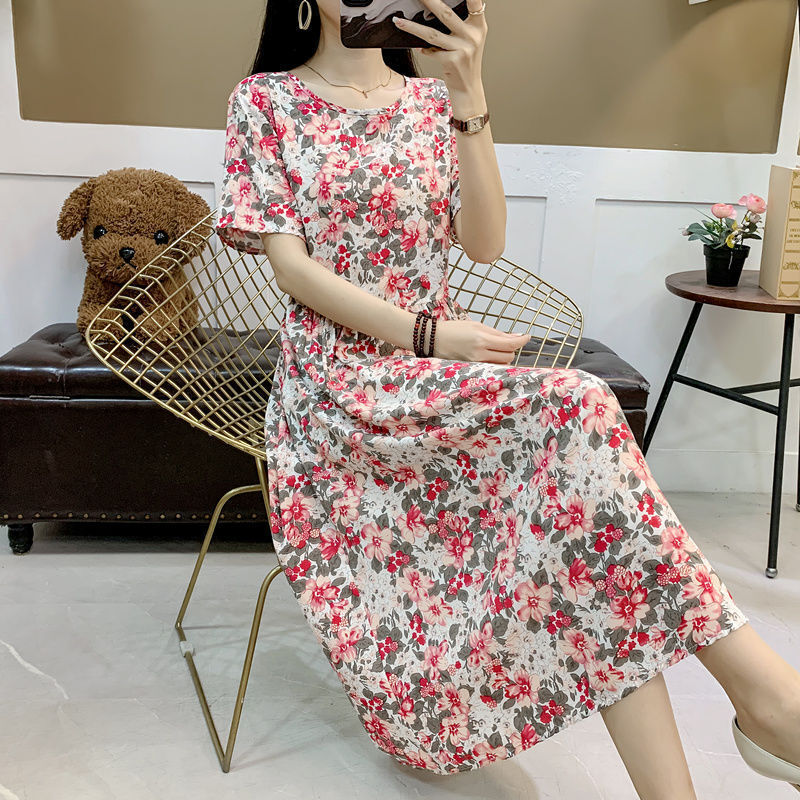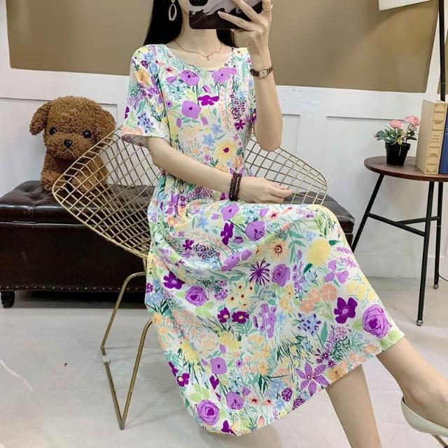 夏季棉綢新款連衣裙波西米亞短袖裙圓領田園風印花顯瘦人造棉裙子