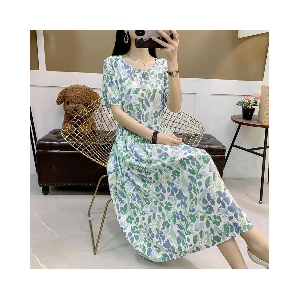 夏季棉綢新款連衣裙波西米亞短袖裙圓領田園風印花顯瘦人造棉裙子
