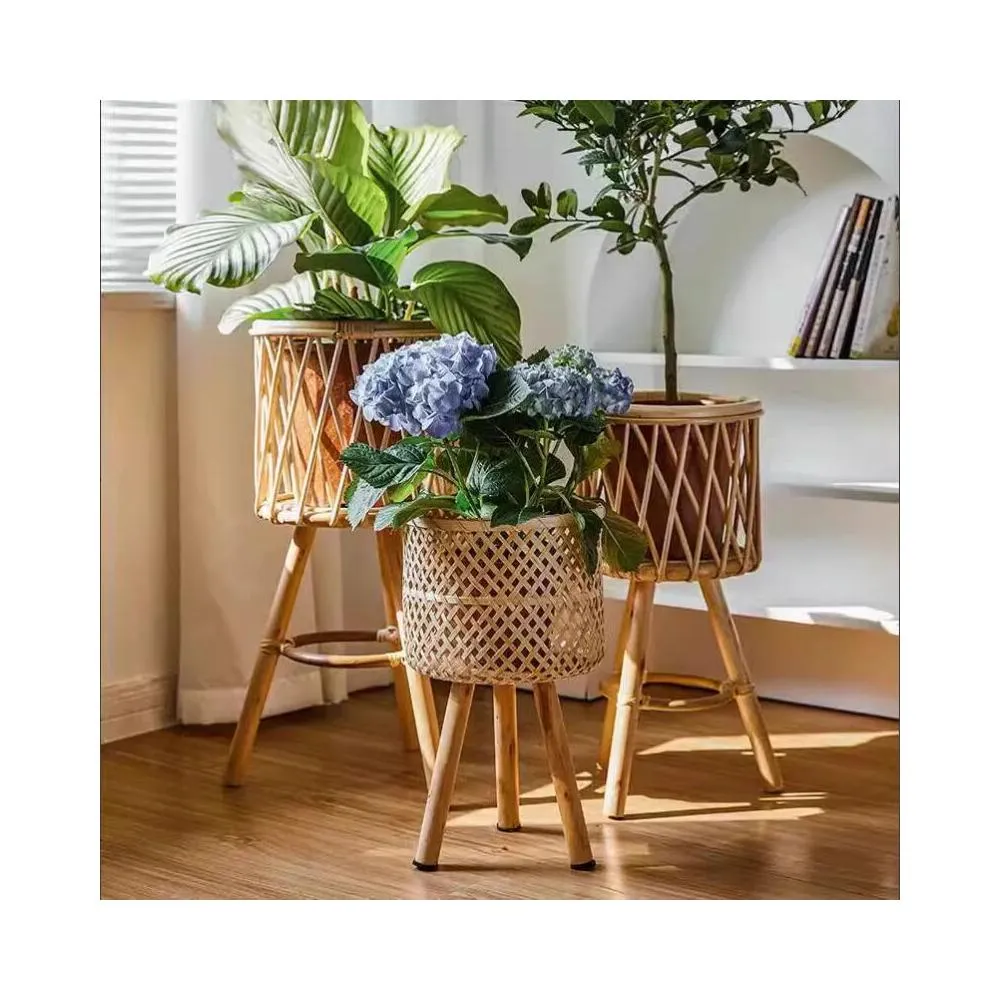 北歐實木藤編花架客廳沙發邊幾落地式竹編置物架墻角陽臺花盆架子