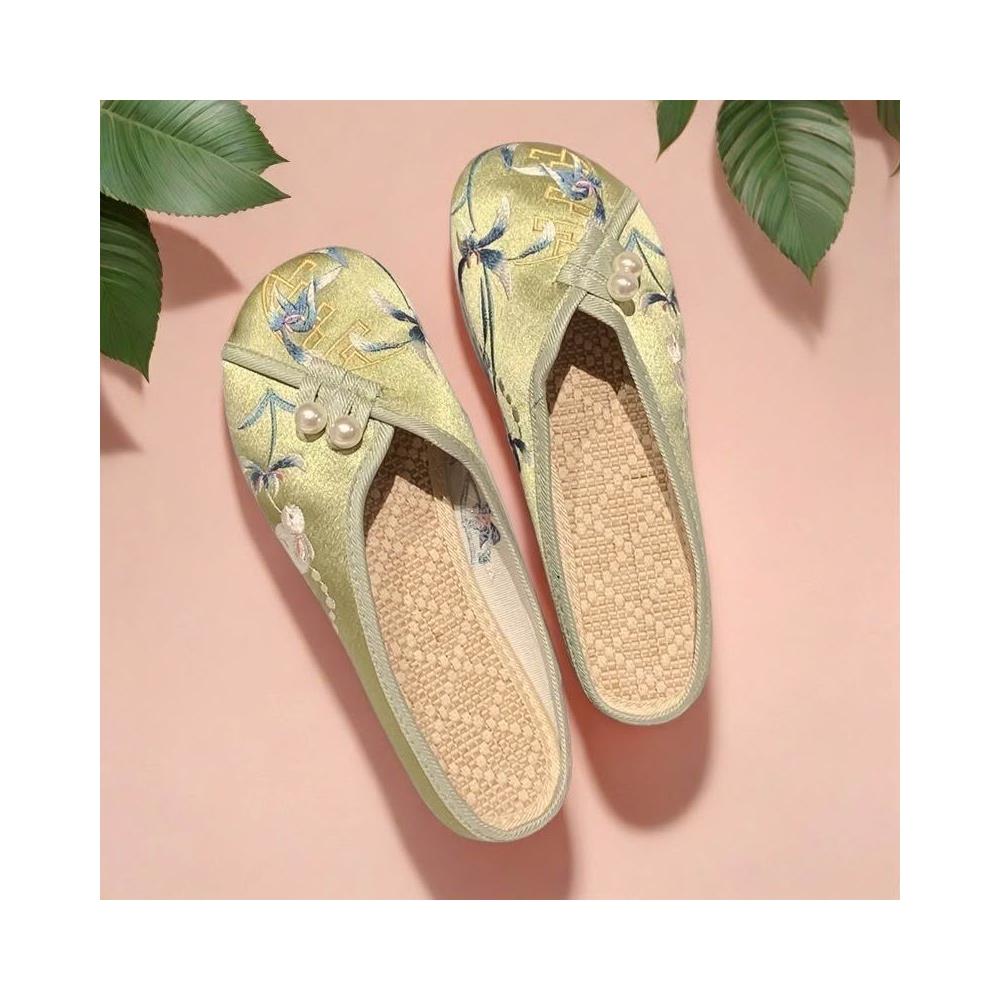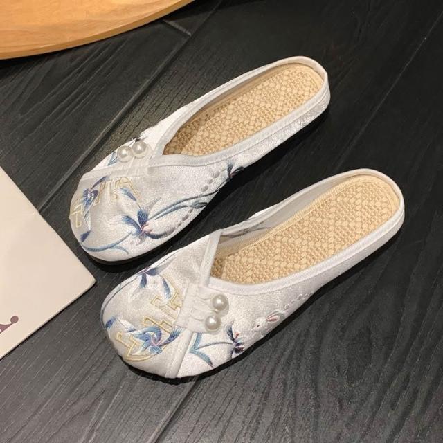 女涼拖夏季復古繡花亞麻拖鞋緞面漢服鞋軟底新中式刺繡包頭拖鞋女