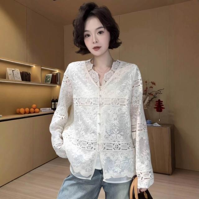 法式溫柔風镂空刺繡V領蕾絲襯衫女2026春新款顯瘦百搭打底衫上衣