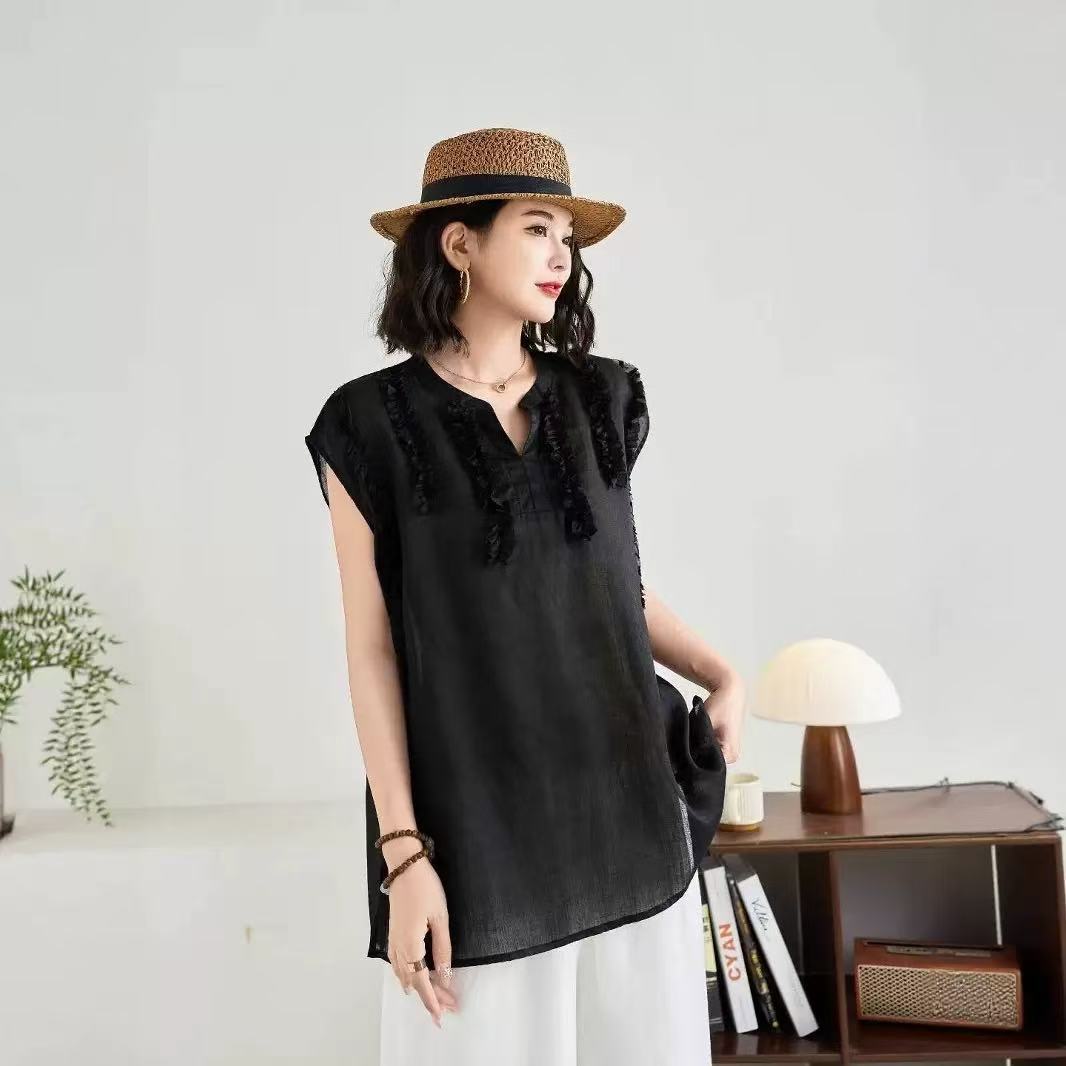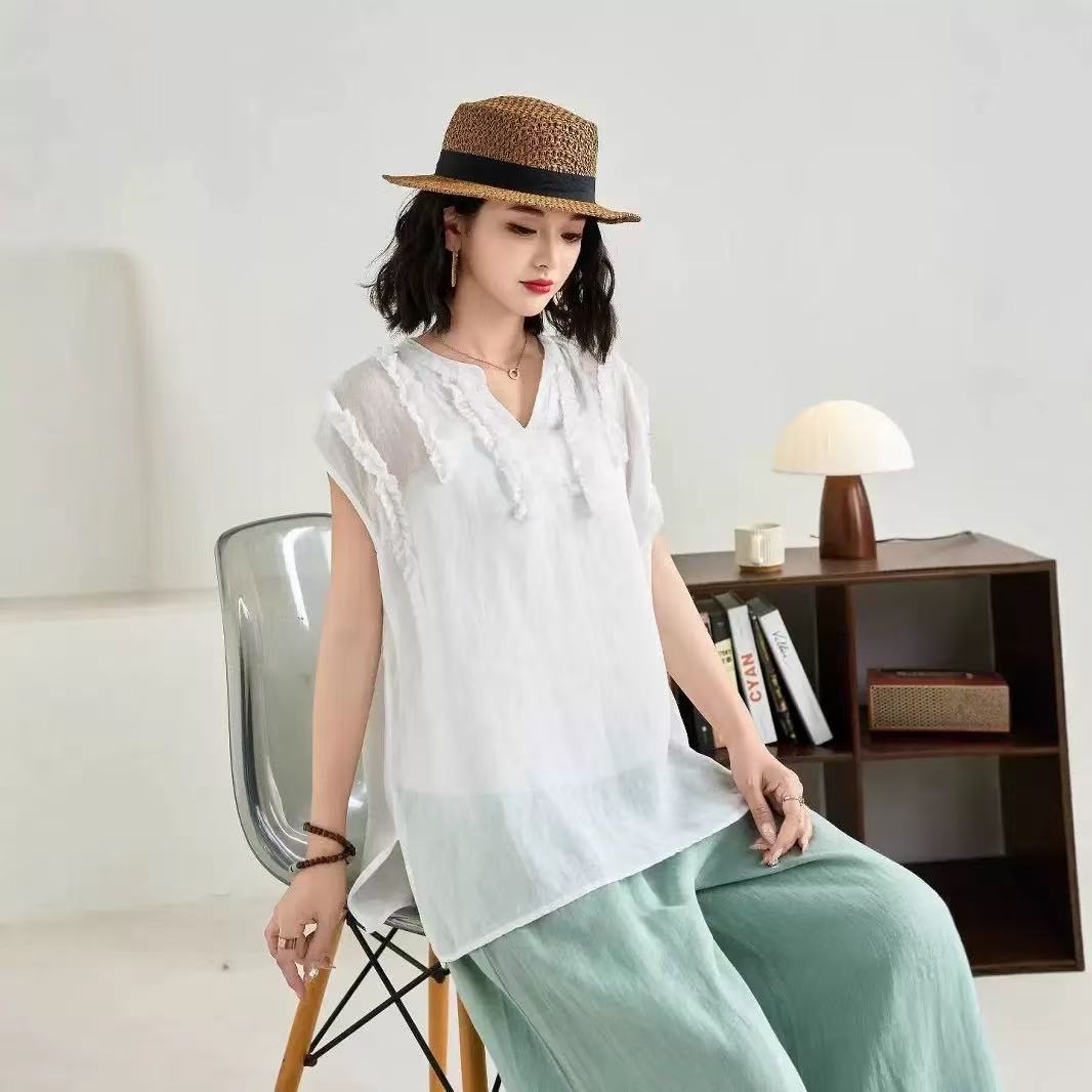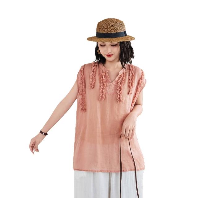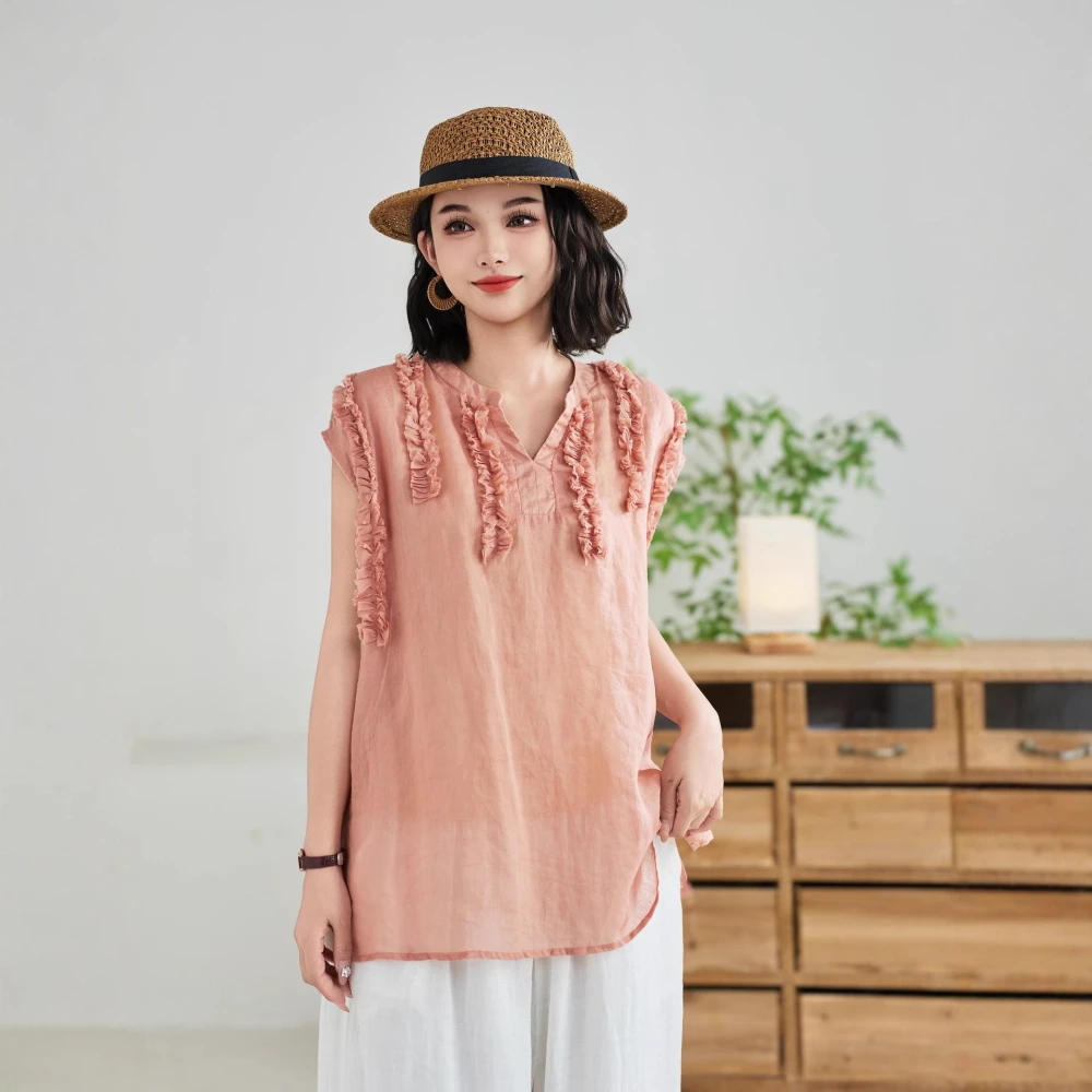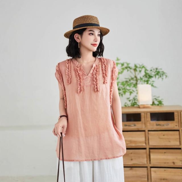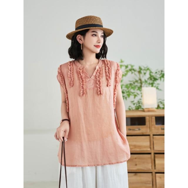 V領木耳邊亞麻無袖上衣女夏季新款法式苎麻減齡老錢風背心T恤衫