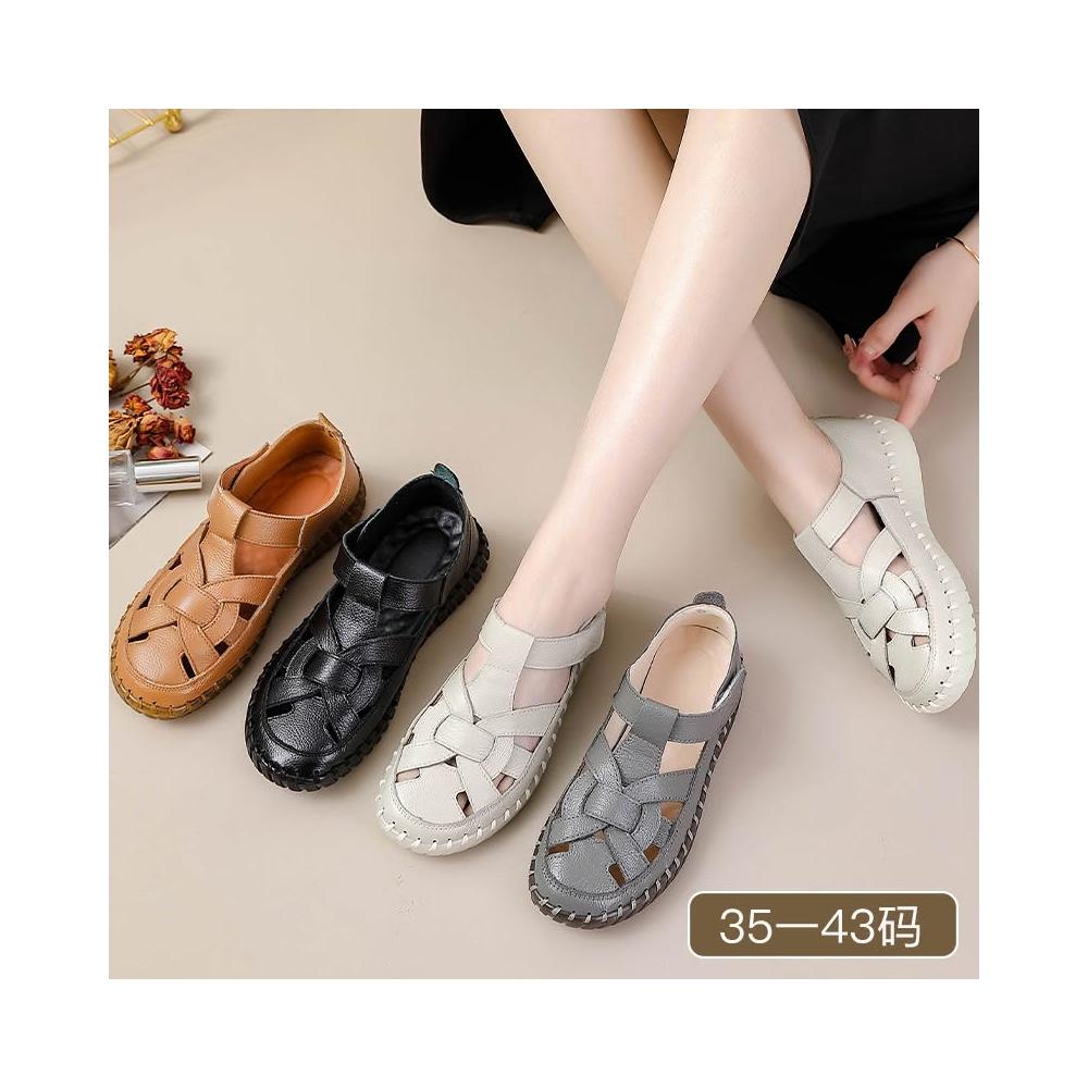 真皮洞洞鞋包頭镂空女鞋夏舒適軟底防滑平底中老年人涼鞋女媽媽款