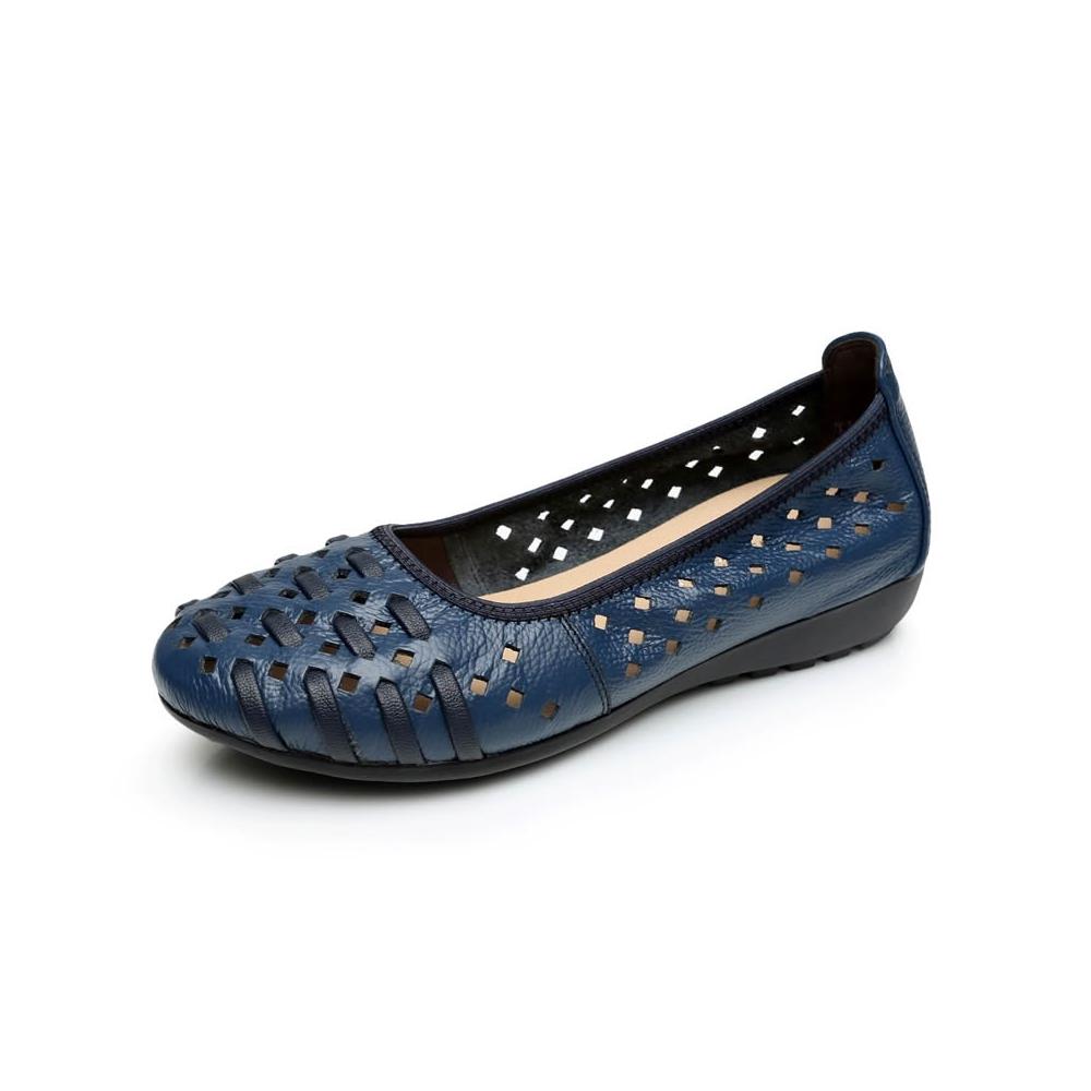 牛皮軟底媽媽鞋平底镂空洞洞涼鞋圓頭淺口大碼女鞋1627
