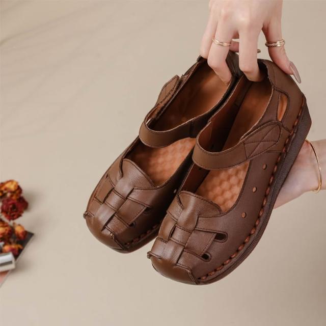 復古真皮軟底舒適坡跟手工跳舞涼鞋媽媽中老年奶奶時尚休閑春夏女