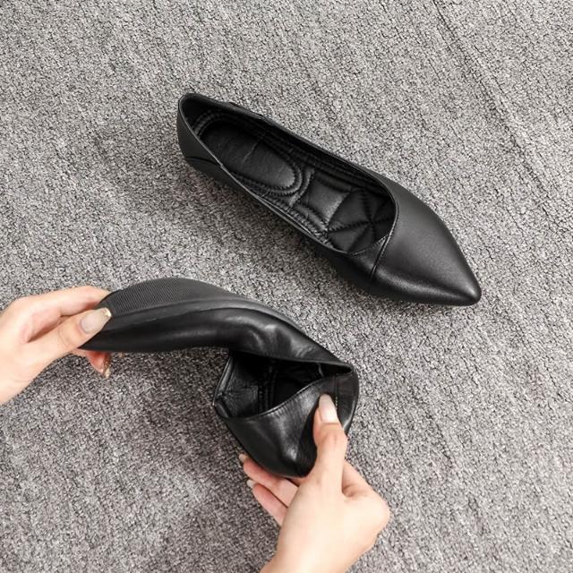 357平底軟底工作鞋女黑色尖頭單鞋女軟皮淺口舒適職業面試空姐鞋