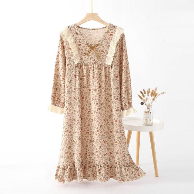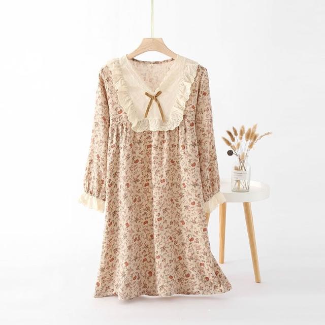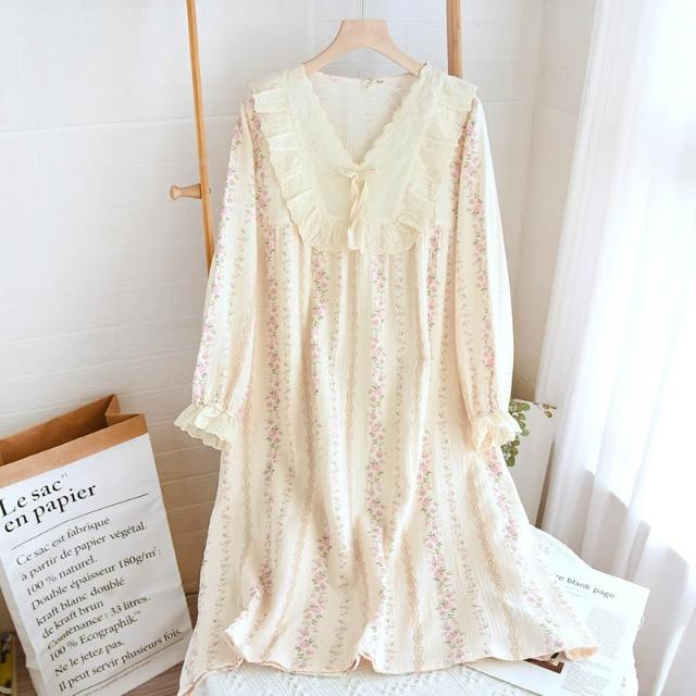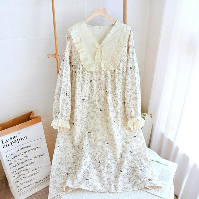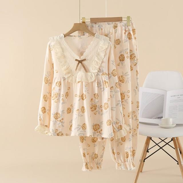 绉布復古蕾絲V領純棉雙層紗春秋女士長袖長褲家居服睡褲套裝睡衣