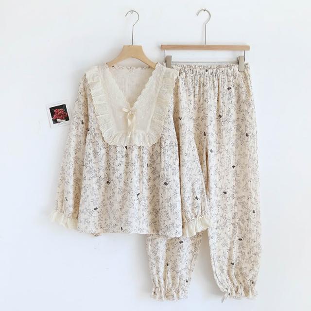 绉布復古蕾絲V領純棉雙層紗春秋女士長袖長褲家居服睡褲套裝睡衣