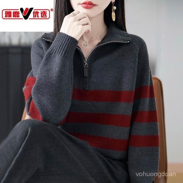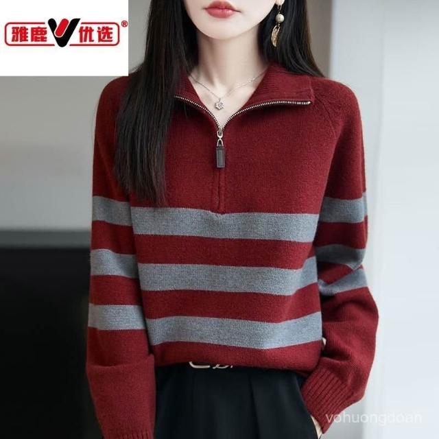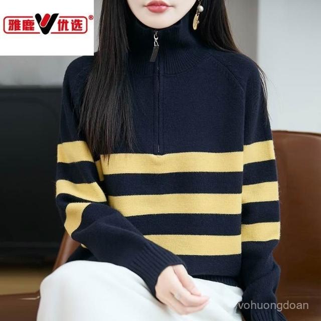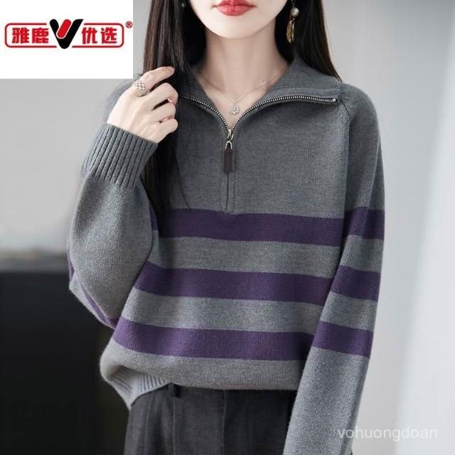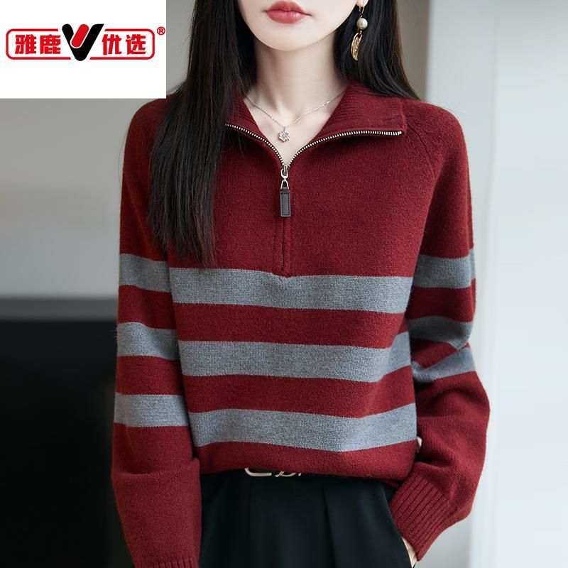 簡約【女裝.女款】雅鹿優選羊毛衫拉鏈條紋寬鬆針織衫年輕秋冬新款洋氣打底毛衣上衣熱賣