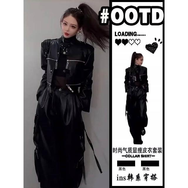 YMR 高級感黑色皮衣套裝女2025新款爆款pu皮短款外套高腰闊腿褲兩件套熱賣