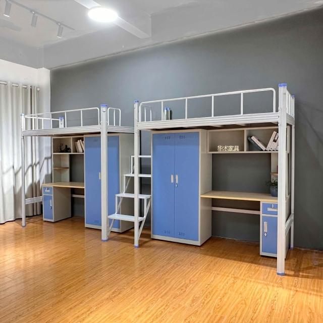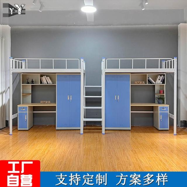 上床下桌組合鐵架床 員工宿舍上鋪下櫃連體床 步梯公寓床學生高低床