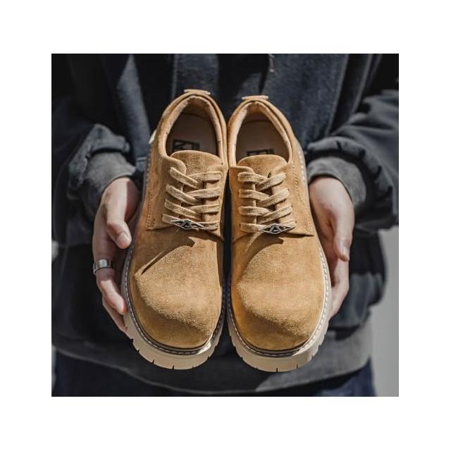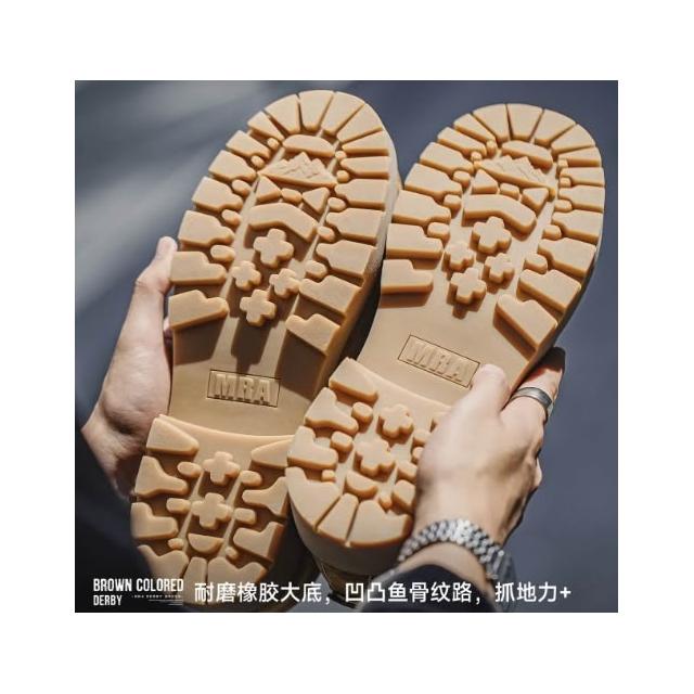 MRA棕色德比鞋男圓頭復古英倫低筒大黃靴厚底增高大頭工裝皮鞋