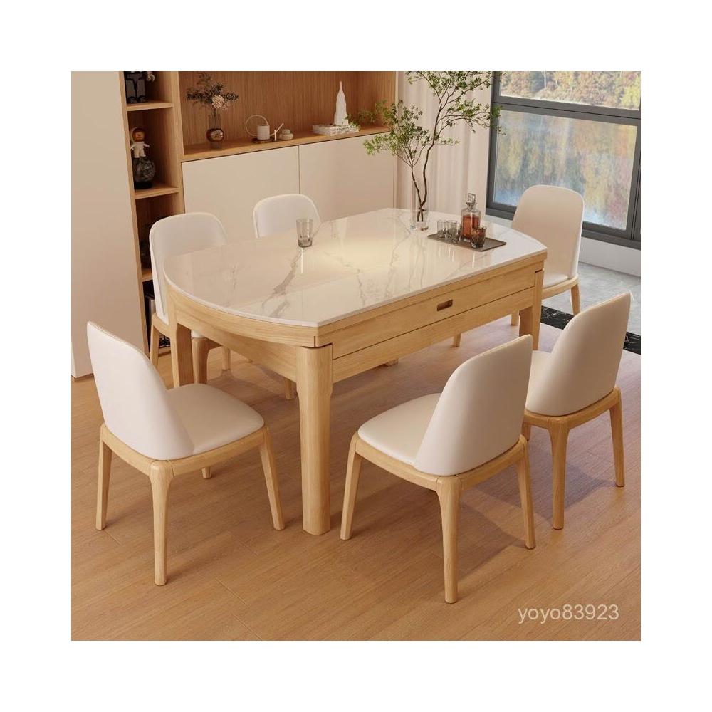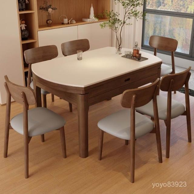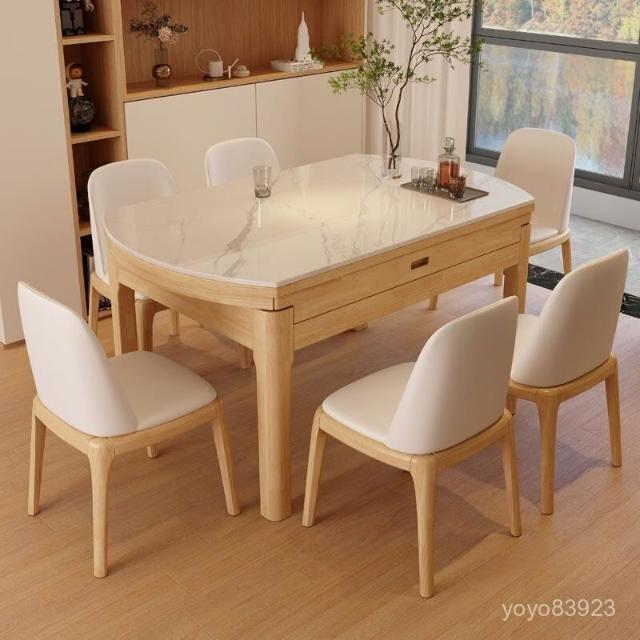 靈感家居 廠家直銷實木巖闆餐桌椅家用原木色現代簡約小戶型奶油風方圓兩用伸縮桌子 Q9TJ