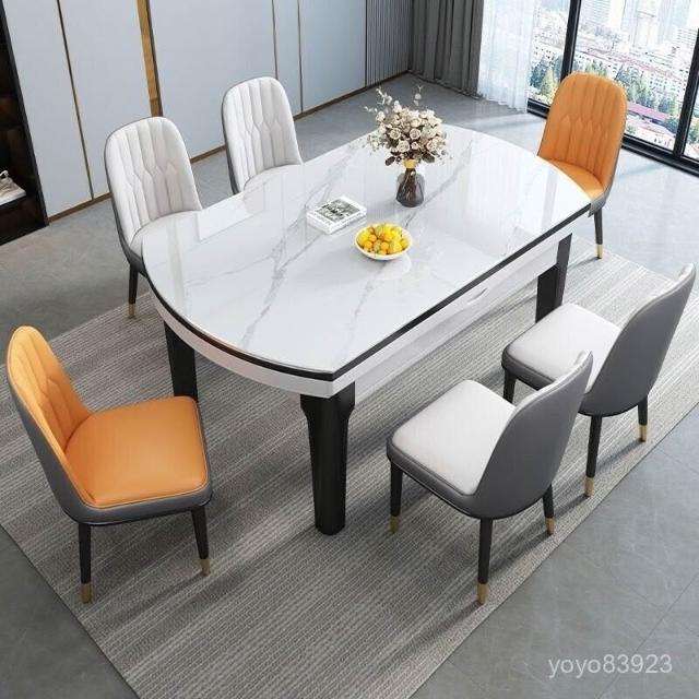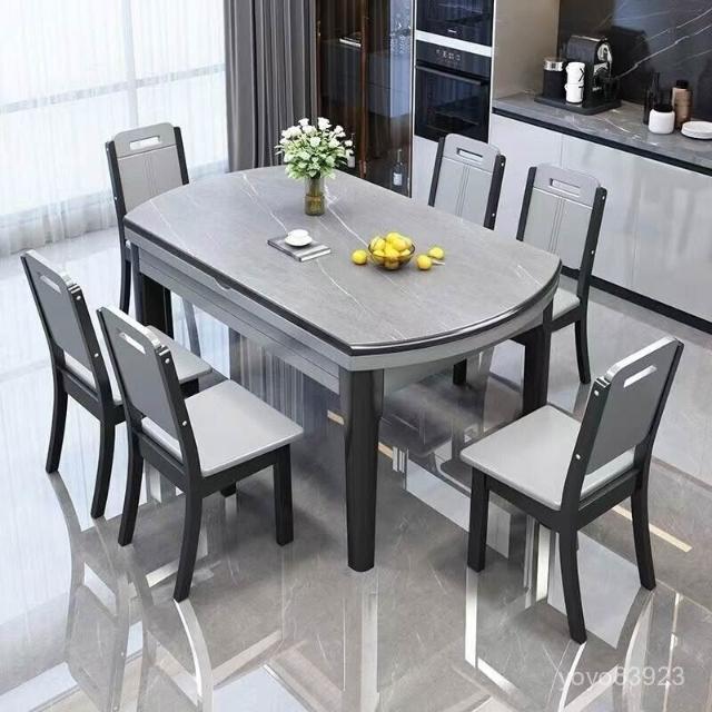 靈感家居 廠家直銷方圓兩用巖闆餐桌椅組閤現代簡約餐桌家用伸縮折疊亮光巖闆飯桌 1VQL