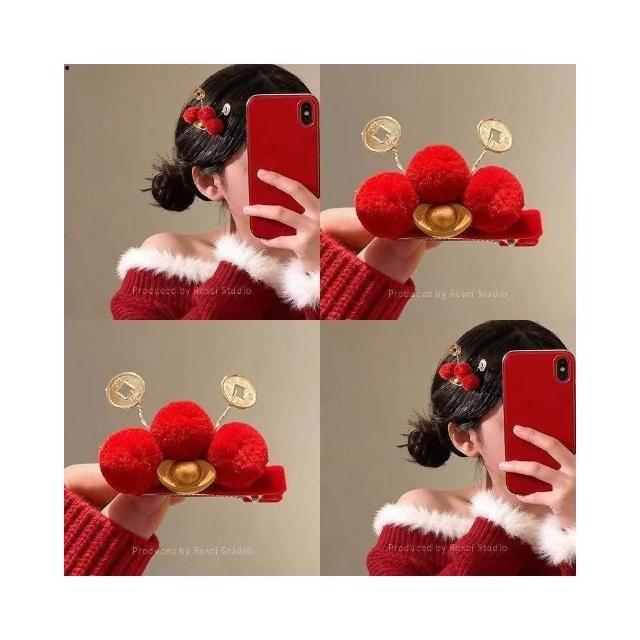 髮夾新年元素紅色毛球流蘇春節氛圍感新中式古風漢服配飾金色元寶頭飾發財髮夾頭飾