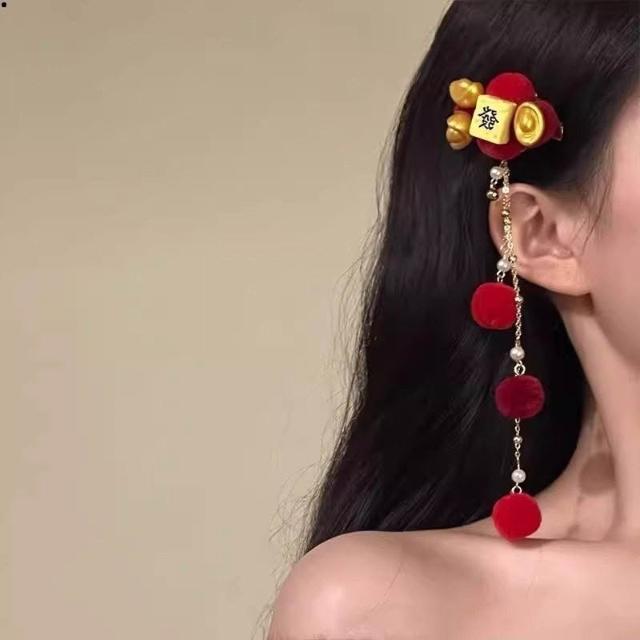 髮夾新年元素紅色毛球流蘇春節氛圍感新中式古風漢服配飾金色元寶頭飾發財髮夾頭飾