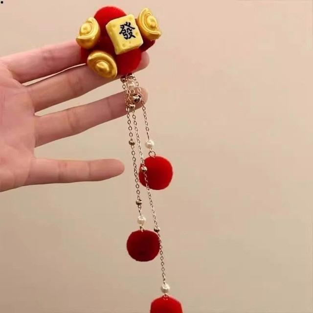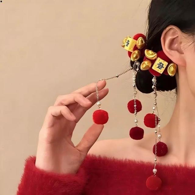 髮夾新年元素紅色毛球流蘇春節氛圍感新中式古風漢服配飾金色元寶頭飾發財髮夾頭飾